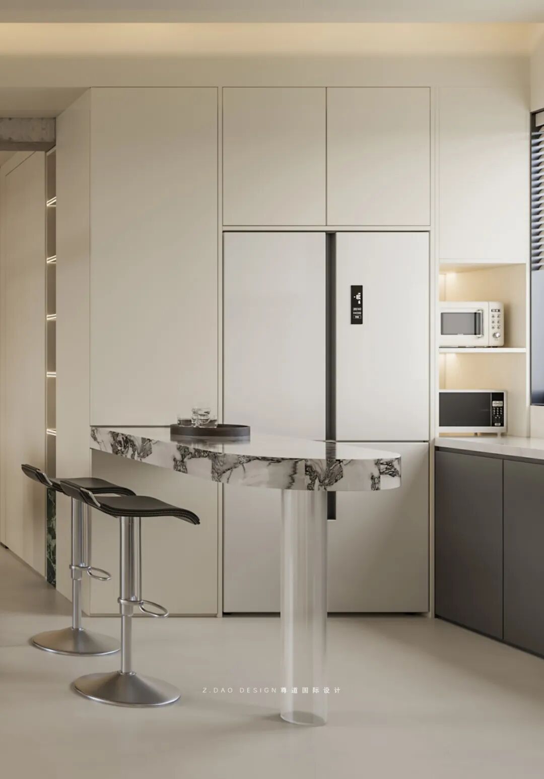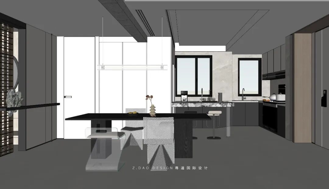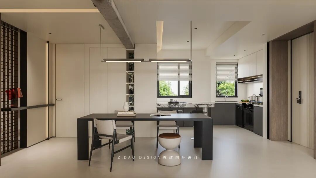 客餐厅布局呈现开放式的递进关系,厨房、岛台、餐桌构成不同场景下的生活舞台,同客厅相望。