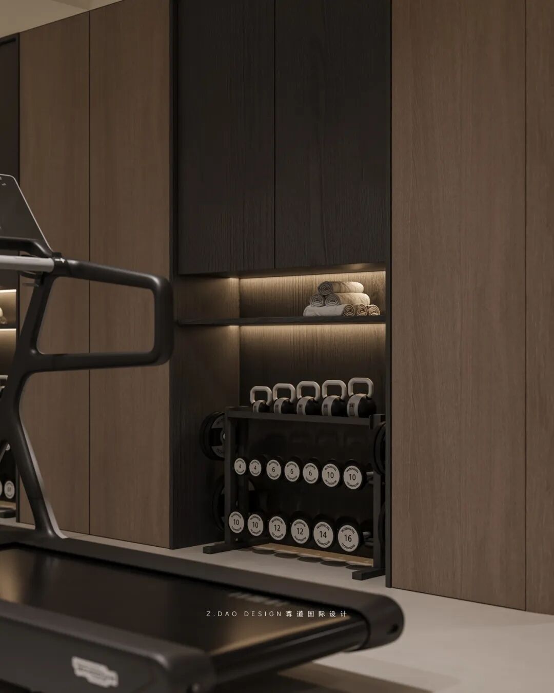 整面收纳柜穿插开放格,边缘弧形过度,既有层次设计感又承包健身区储物。