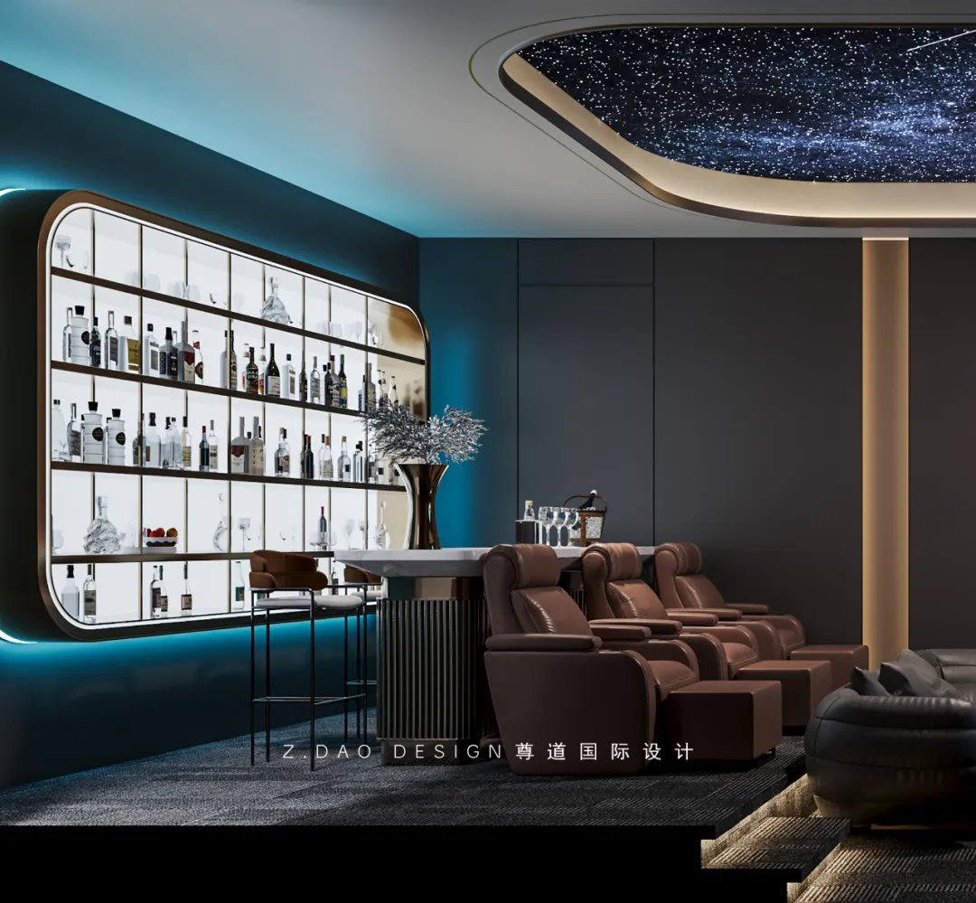 影音室的设计根据空间实际情况,后排砌台阶,后排放置吧台,墙面定制酒柜。