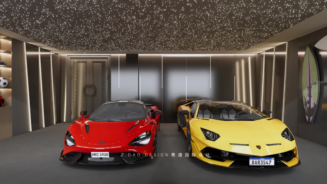 无主灯设计+星空顶,营造满目繁星的无边际视野;大面积金属洞洞板可以挂球拍,自行车,冲浪板等。
