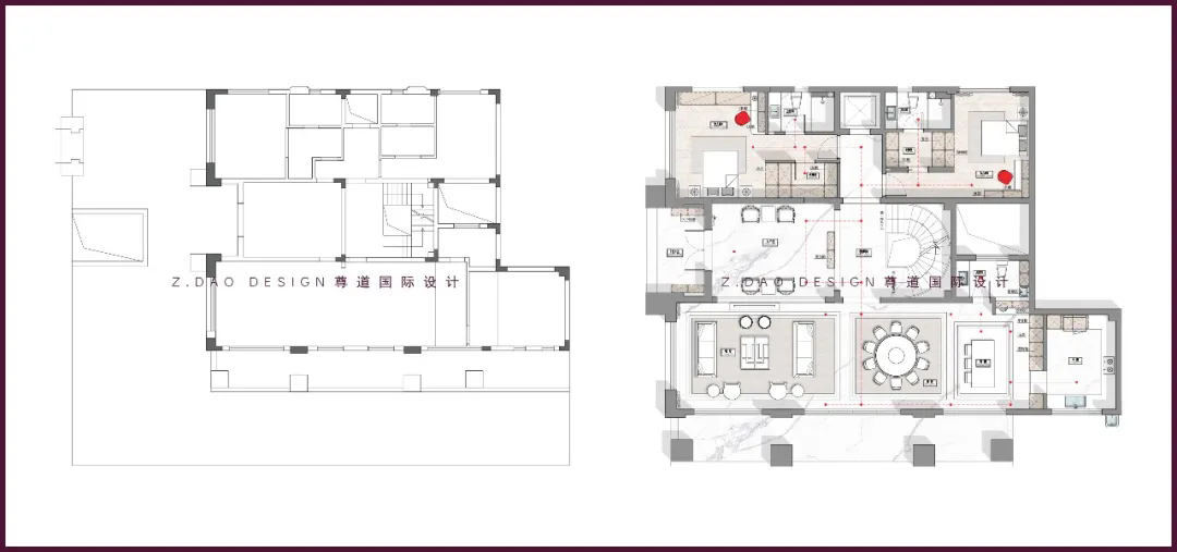 2、入户右侧依据柱子位置从新规划餐厅,高尔夫球室,楼梯,影音室,右下方位置纳入室内规划为酒窖。