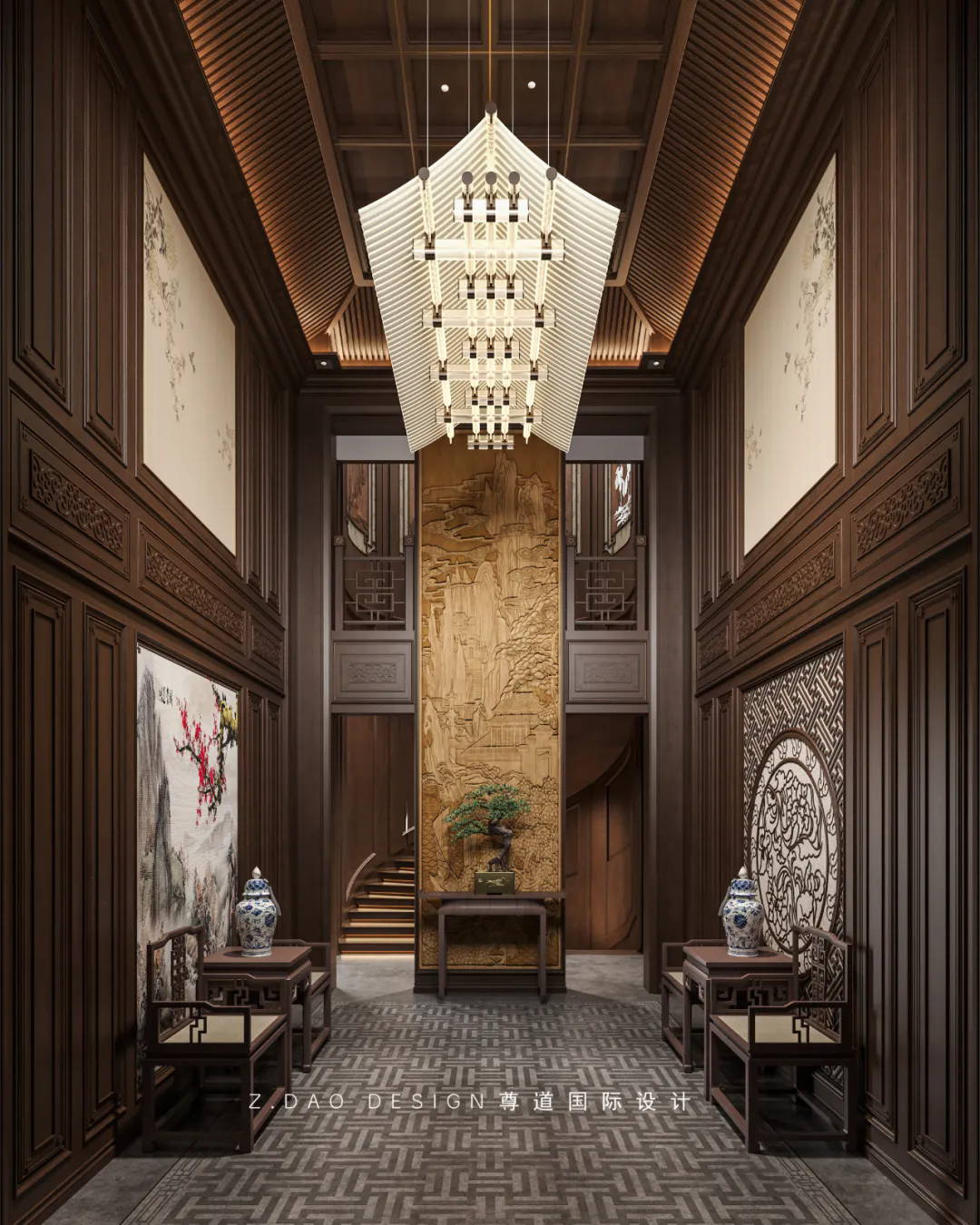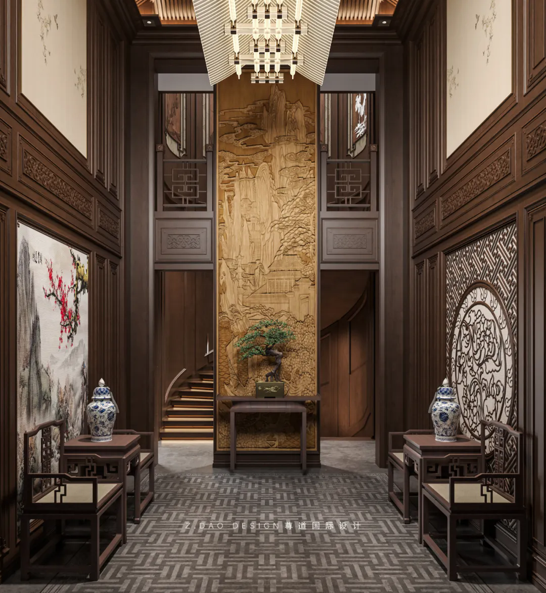 门厅尽头是入户端景,端景的中间采用了玉石雕刻作为主背景四周用石材作为点缀,这样的设计下整个入户空间更加沉稳大气。