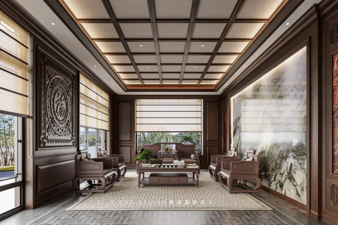 沙发背景墙的设计采用了两边木雕中间大理石的对称设计手法,给人一种诗意东方,悠远宁静的感觉,木雕与奢石的装饰也勾勒出空间奢华的基调。