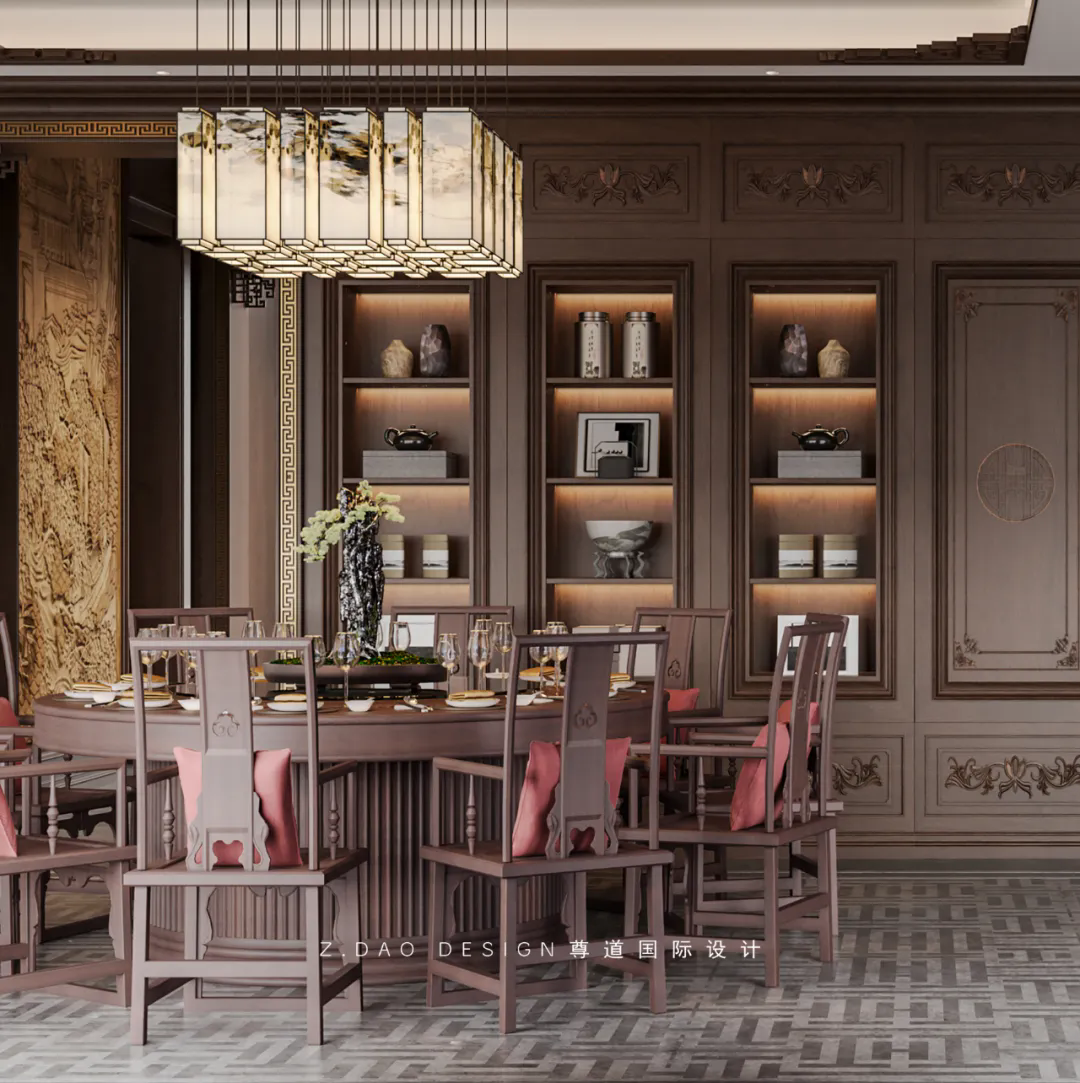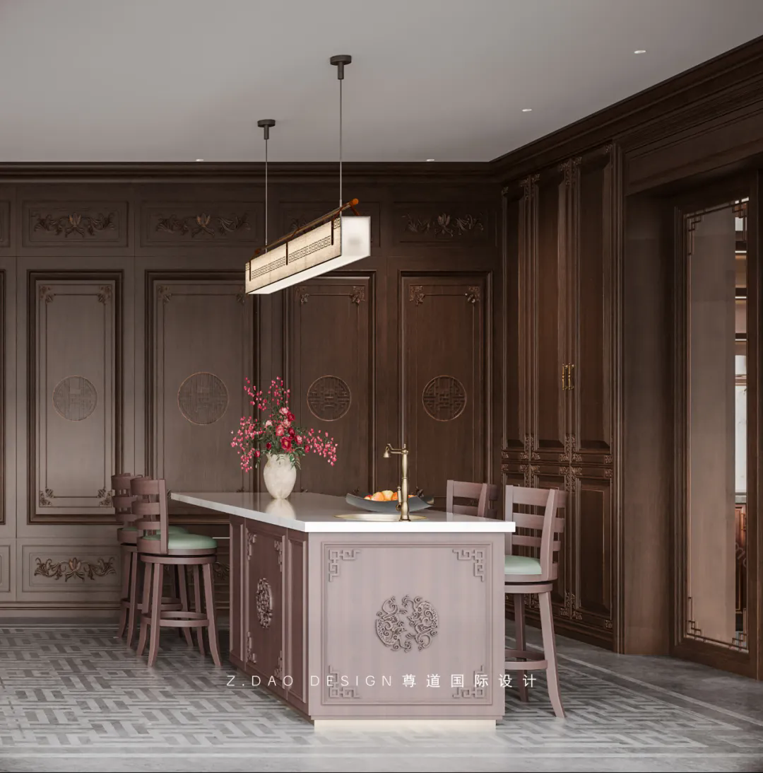为了方便休闲聚会设计了水吧台,中式定制柜体,加上石材台面,整体给人一种大气沉稳的感觉,后面设计了开放格柜体,可以用来储物或者放置艺术品用来展示。
