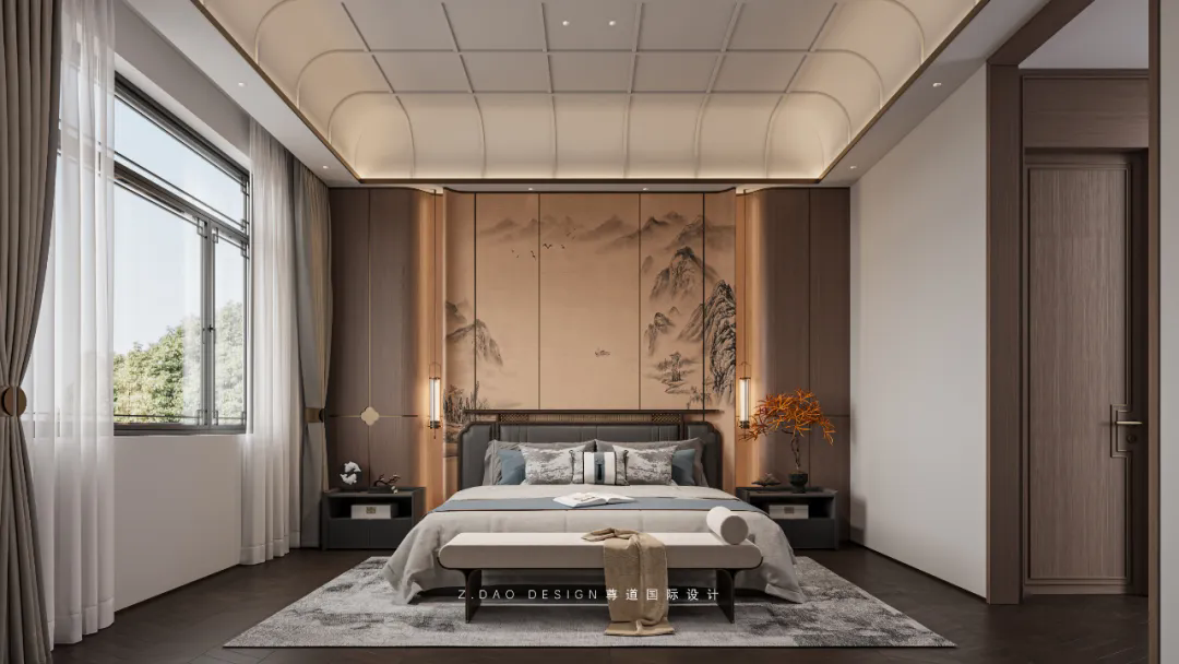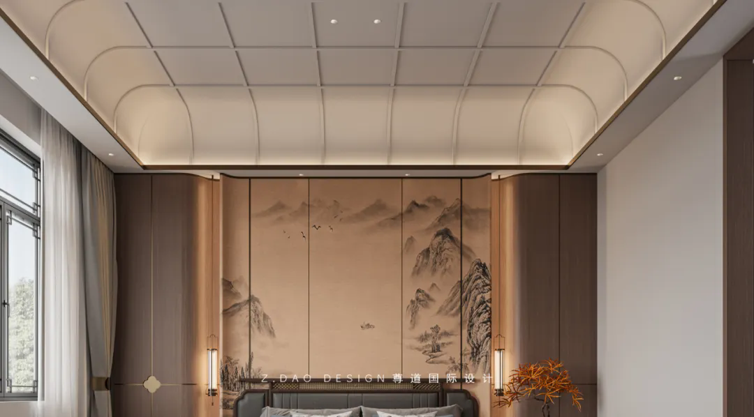 床头背景采用了海棠角的设计,海棠角是传统的中式造型,被视为典雅、端庄的象征,与中式的建筑美学相得益彰,海棠角里采用了中式最传统框景,墙面定制硬包,花鸟寓意着吉祥、繁茂、富贵。