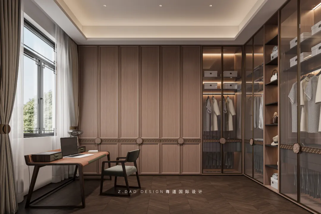 书房整体以黑胡桃木色为主色调,既能够体现出传统文化的沉稳和内敛,又能够满足现代人对于简约和舒适的需求。书桌后面配备了一整面墙的博古架,书架不仅是用来存放书籍的,同时也可以用来展示藏品和装饰空间,功能颜值好,实用性也强。