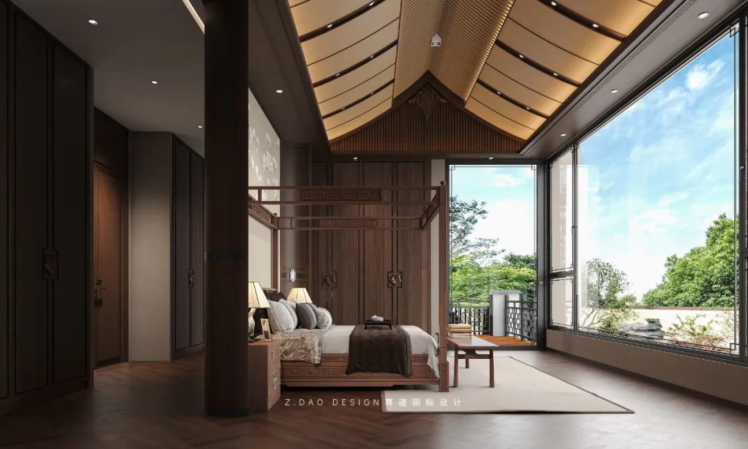吊顶木雕的巧妙运用则为卧室增添了一份古典的气息,仿佛是穿越时光的窗口。