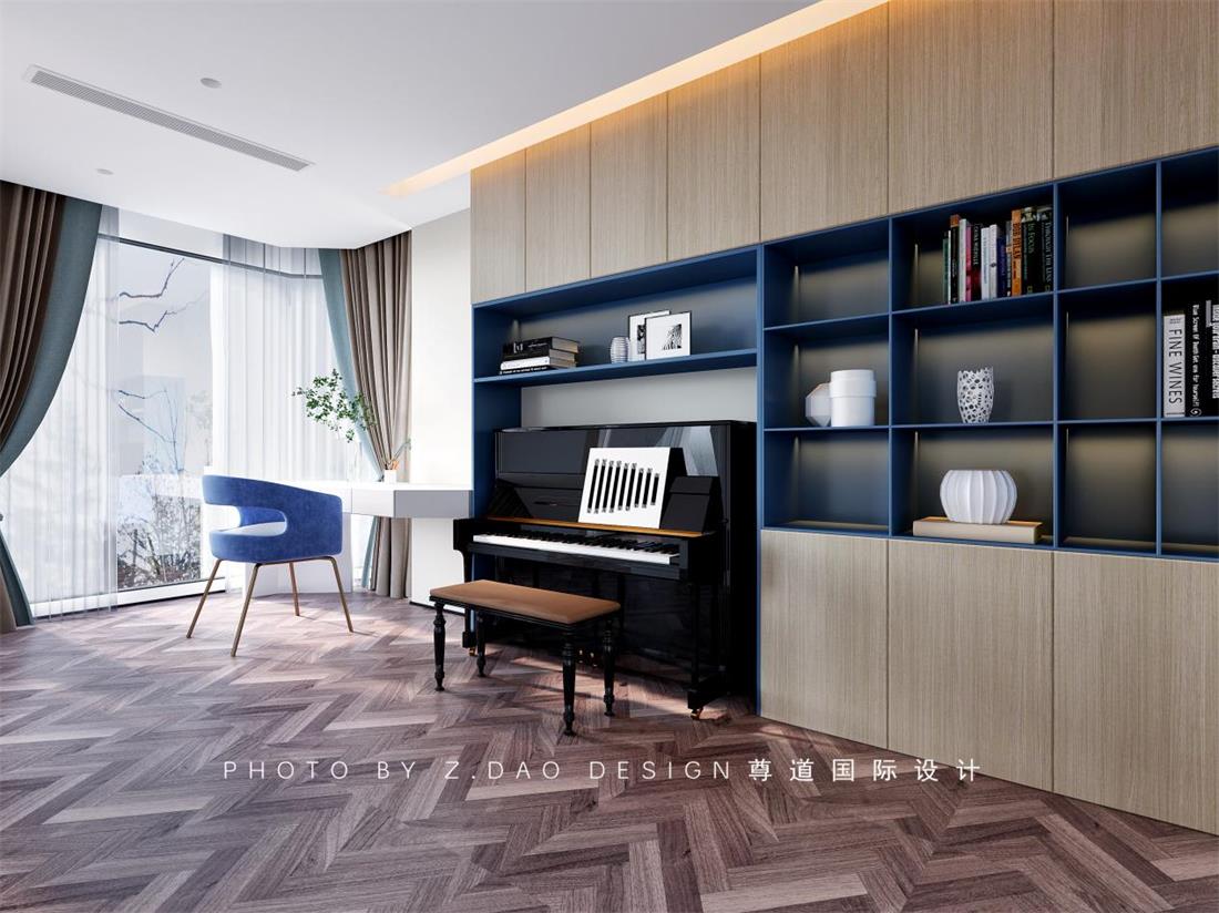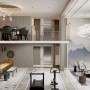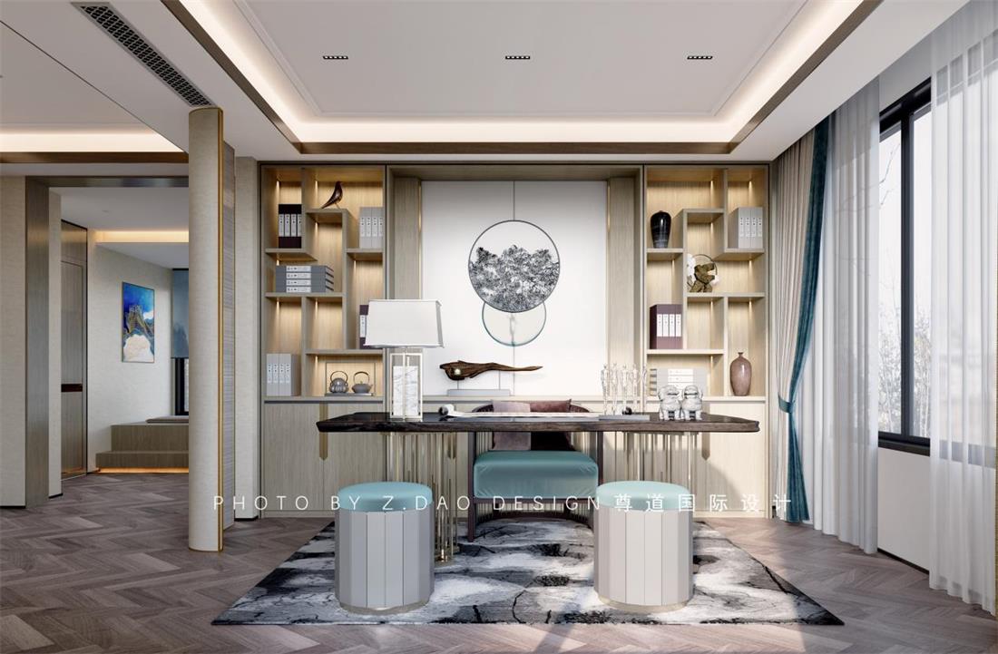 寄情于山水之间雕琢于笔墨书卷是宁静淡泊的心志向往,书房的呈现是一种追求书香意气的感觉,对称比例的划分,也是一种对新中式的解读,沉稳而更注重协调,场景的敞开,成为了套房空间的一个媒介。让空间更具融合感,在空间的方圆之间有节奏的跳动着,居住者被这种韵律引领至生活的另一境地,每件器物拥有情感,每次呼吸都变得缓慢和有意义,这样一处静心思考与深度交流空间,不仅是现代都市里忙碌者的精神需求,更是安放自身心灵的栖息地。