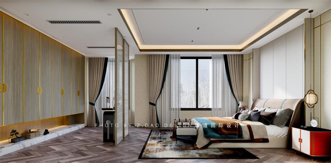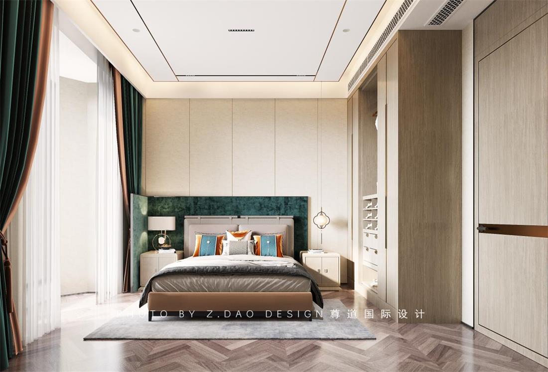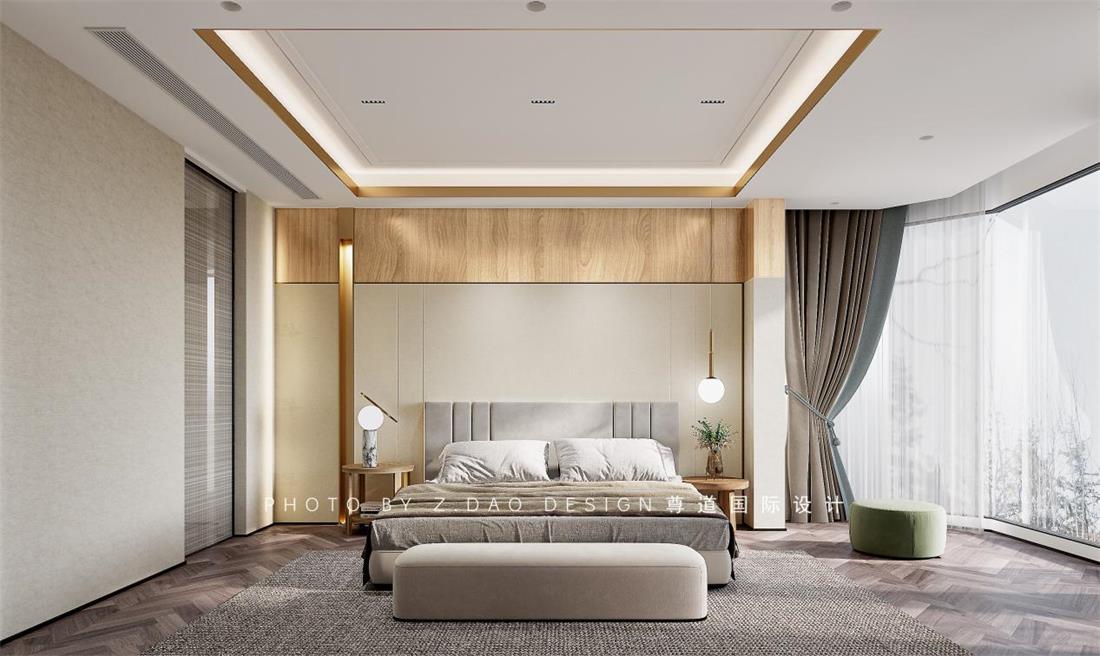 长辈房床头靠背采用弧形造型,包围感给人以安全感;材质用了硬包,比较温馨;主背景采用竖向的分割拉升层高。
