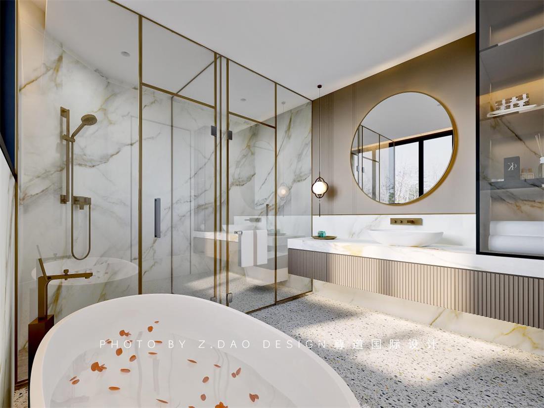 主卫的感觉是延续着卧室空间的,暖意洋洋的既视感,洗手台结合储物柜,点缀了中式的吊灯,空间有了氛围,饱满的形美有了储物功能的加持。