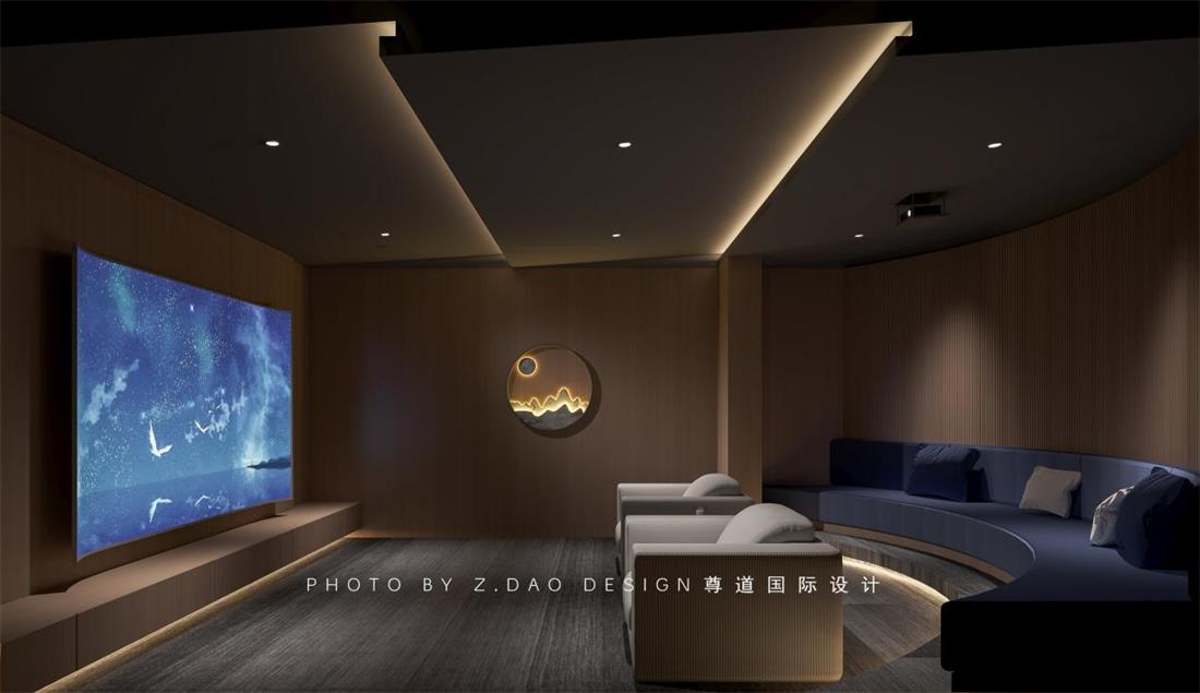 影音室故意设计成了一个包围感很强的构造,也是在阐述着圆的元素,一盏山水的壁灯,也就成了空间的风格点缀。祥云状的吊灯是空间的精致体现,玻璃云朵貌似在看着天井外的天空,借着天井和天空说话。