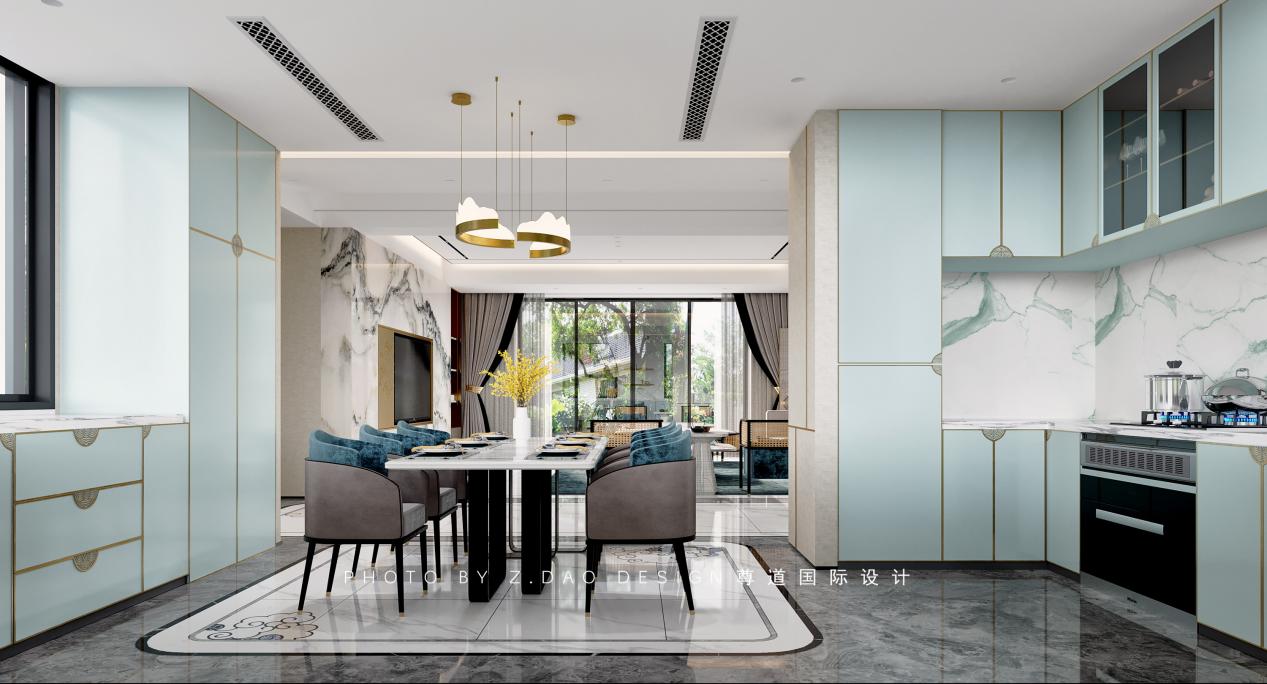 精致的餐盘搭配清透的石材。以器皿点缀其中虚实互映中交织出自然的诗意与东方的风雅;原始餐厅和厨房的空间得到了扩展,餐厅融入了厨房,厨房也变成中西厨的分离,西厨的加入,让功能更加的实用化;蒂芙尼蓝的运用,加上不锈钢的中式把手,让精致变成了种种细节,地面祥云图案的瓷砖拼花也是寓意着吉祥如意。