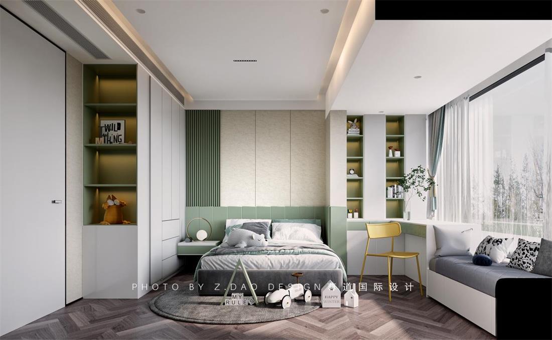 独具趣味的摆件为空间带来别样的柔情在现实和梦幻的交界处用和谐柔美的气韵将空间缓缓点亮色彩的纯度,造型的竖向拉伸,场景的不同切换,这是二女儿的房间,喜欢莫兰迪色的神秘以及稳妥,无主灯的设计让场景更加梦幻,衣柜设计有敞开格,书桌设计有可以躺下的飘窗,一切都在为这位爱看书的小姑娘打造着,再对接孩子们的卧室的时候,我们和业主运用的时间是最多的,这也是业主觉得最重要的地方。给孩子一个温暖的房间和温馨的家。