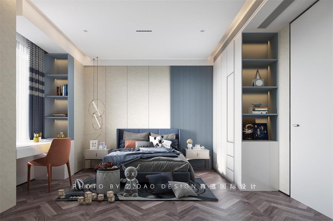 小儿子的房的大小跟二女儿的房间差不多,很多类似的元素,但是颜色的使用就不太一样了,蓝色是这个孩子喜欢的颜色,没有过多的用卡通的造型和装饰,而是更加的简单和简洁,舒适感,品质感是追求的目标。