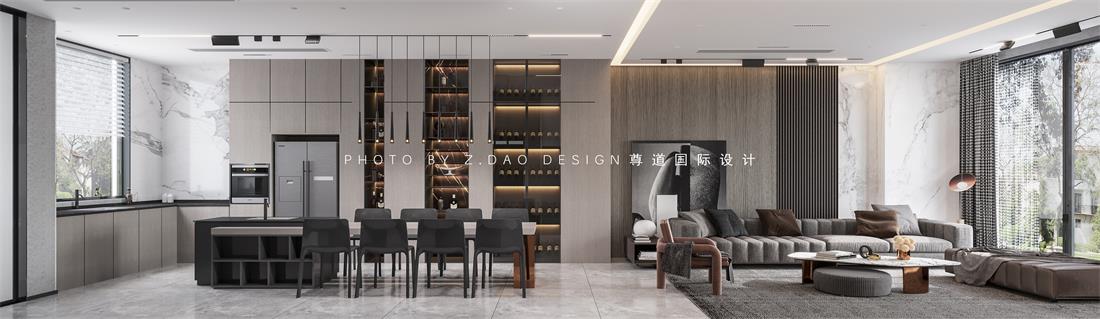 餐厅的设计是和西厨的结合,长餐桌设计也是当下比较流行的风格,吧台和餐桌设计空间里融合酒柜设计与冰箱的设计空间。西厨设计增加了水槽与电磁炉,可以在西厨烤牛排,做西餐。