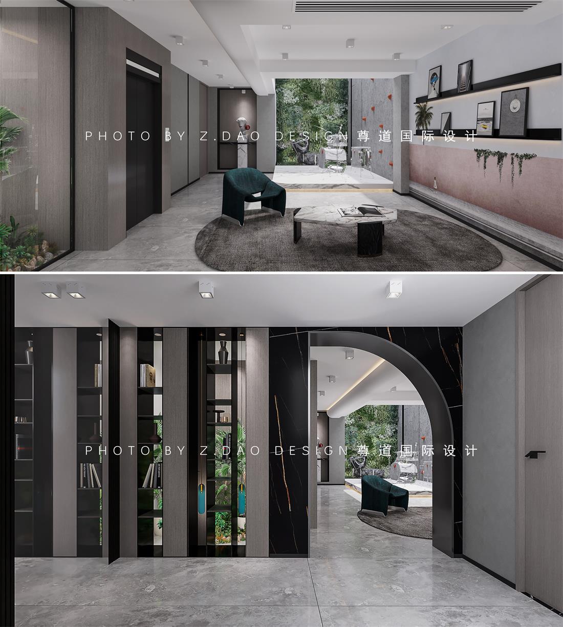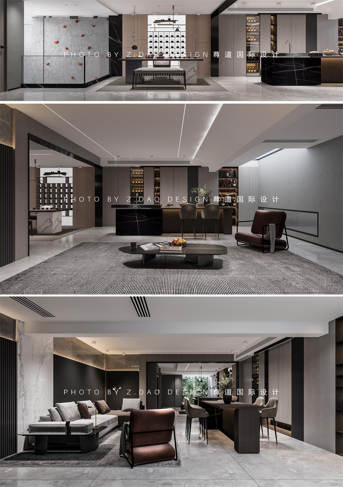 负一层的设计也是以大开间为主,茶室和休闲区通透融合在一起,茶室营造了些许的禅意氛围。休闲区集合了电影、品酒、卡拉OK、娱乐等在一起的功能,是一个集合空间。