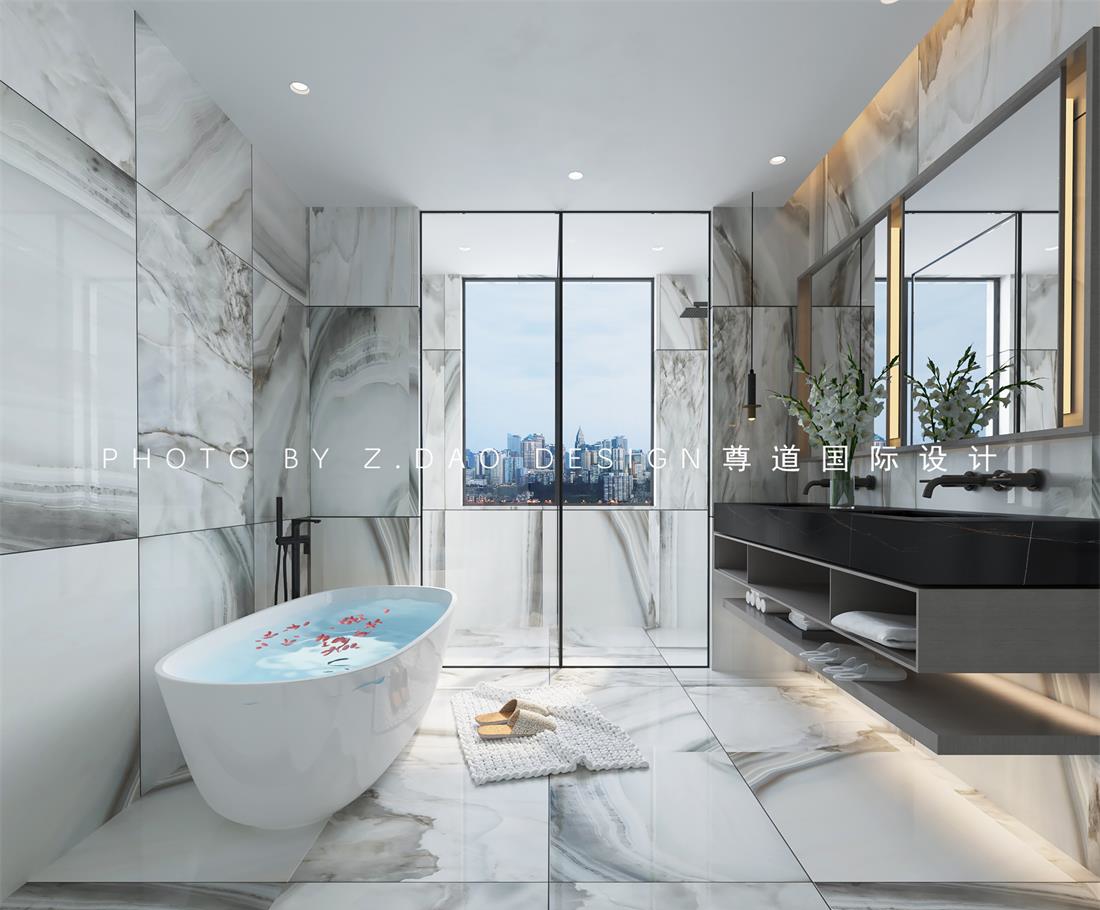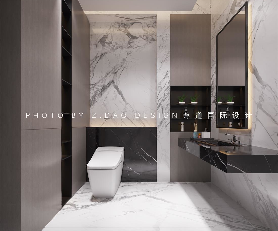 主卧卫生间为干湿分区,四分离设计,防潮石膏板吊顶,顶上嵌入反光灯带。