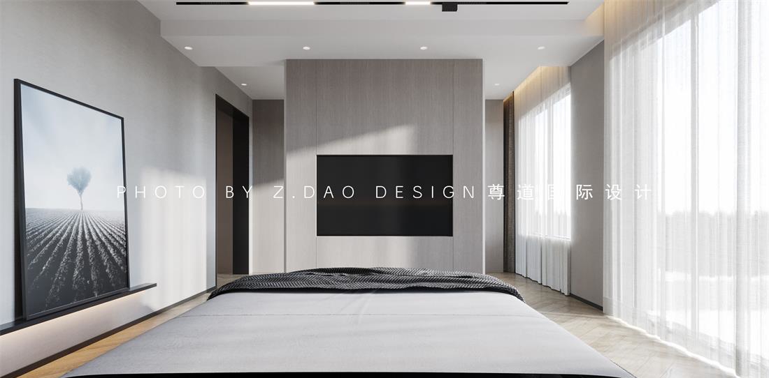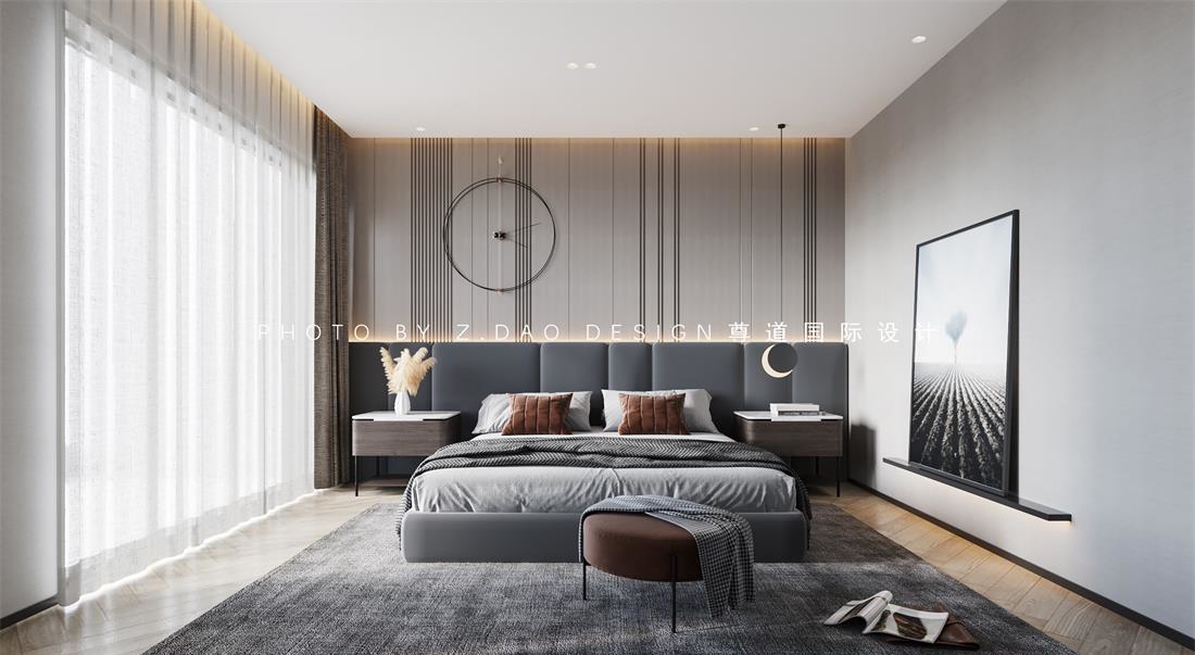 主卧室的设计床头背景分段式设计,下面是软包设计,上面是木饰面设计,下面是软包带反光灯带设计,上面墙板设计抽槽设计。