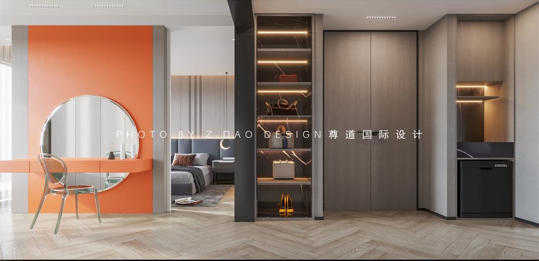 主卧里梳妆台的设计是橙色烤漆色板,梳妆镜是个大圆镜,上下分开,衣帽间设计左边为隔断设计,右边为一个冰吧。