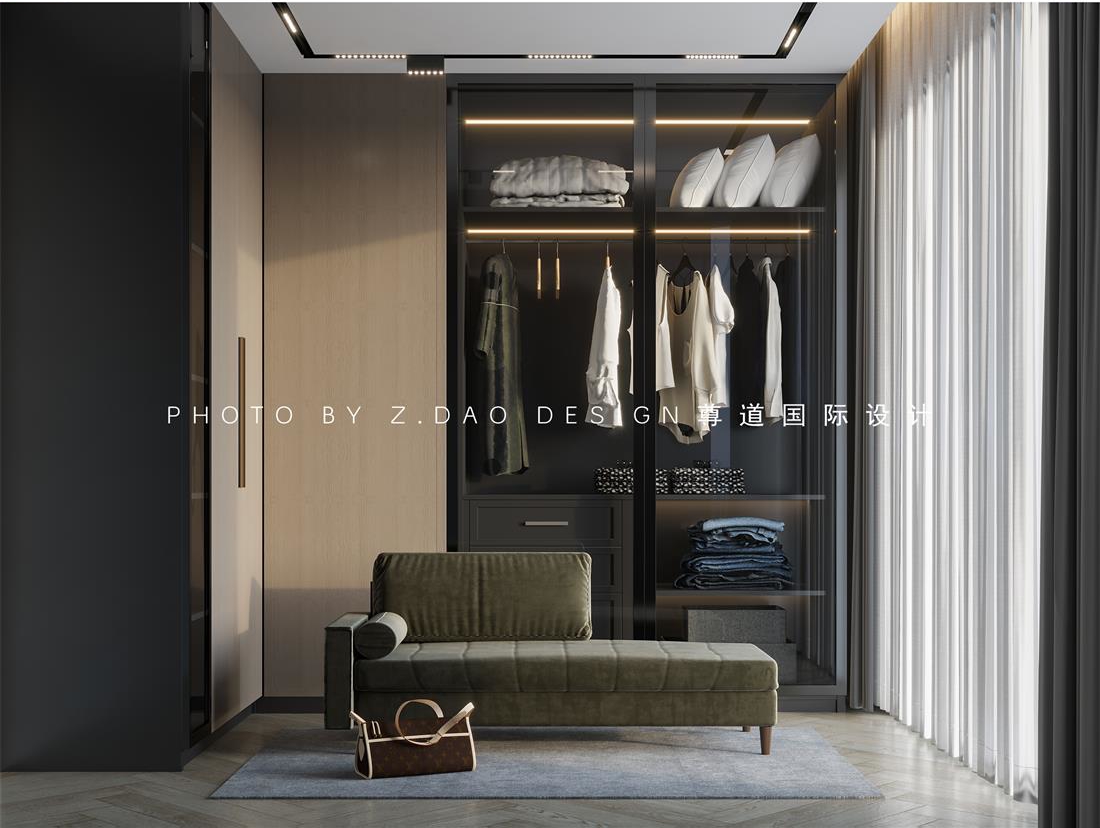 衣帽间设计为木质门与透明玻璃门结合一起设计手法,柜体带感应灯带。