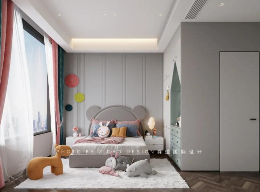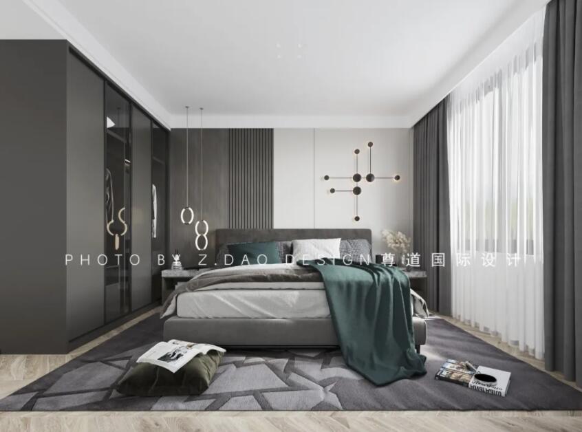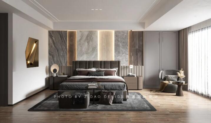 现在大多的大宅别墅的主卧,在原始户型上都是主卧+卫生间的模式,本案保留原始户型设计,设计上根据业主的喜好,将材质、色彩、光源巧妙融合,营造一种安静、舒适、惬意的现代风空间。