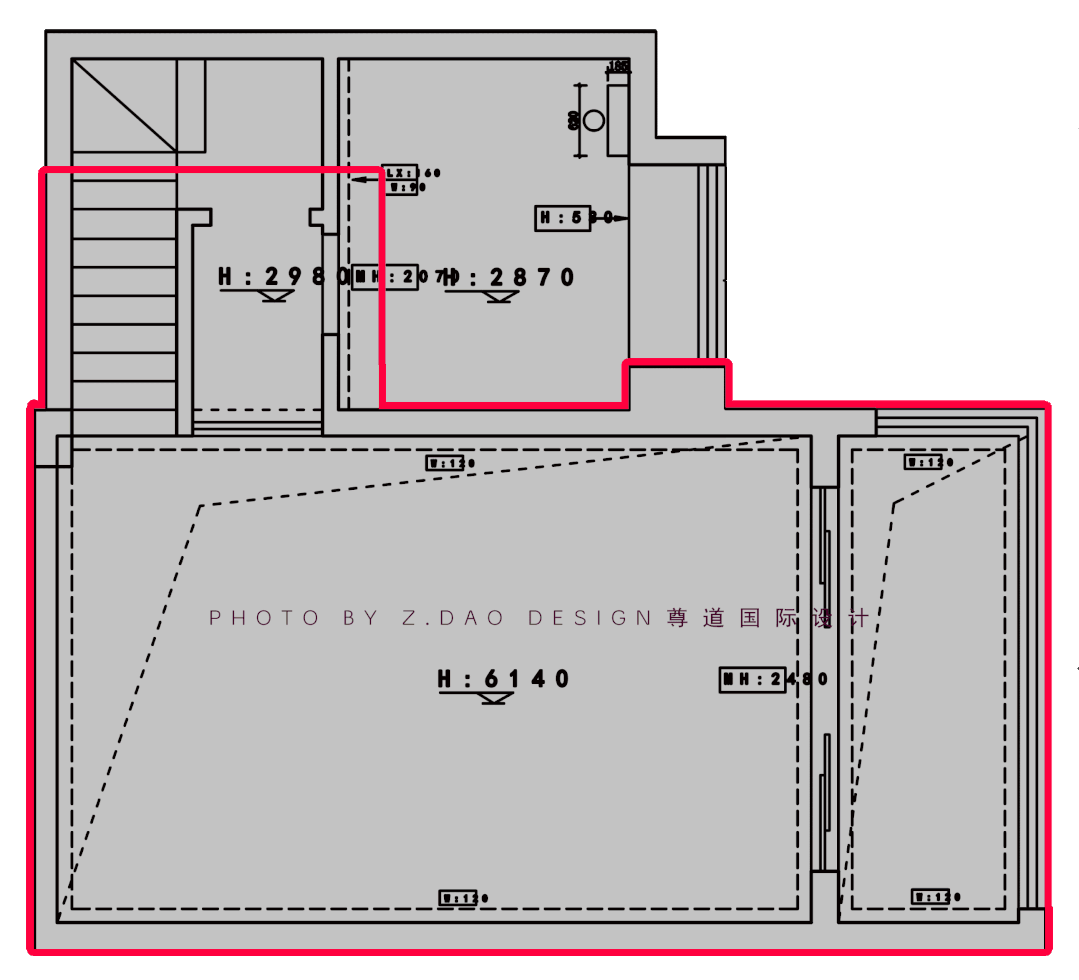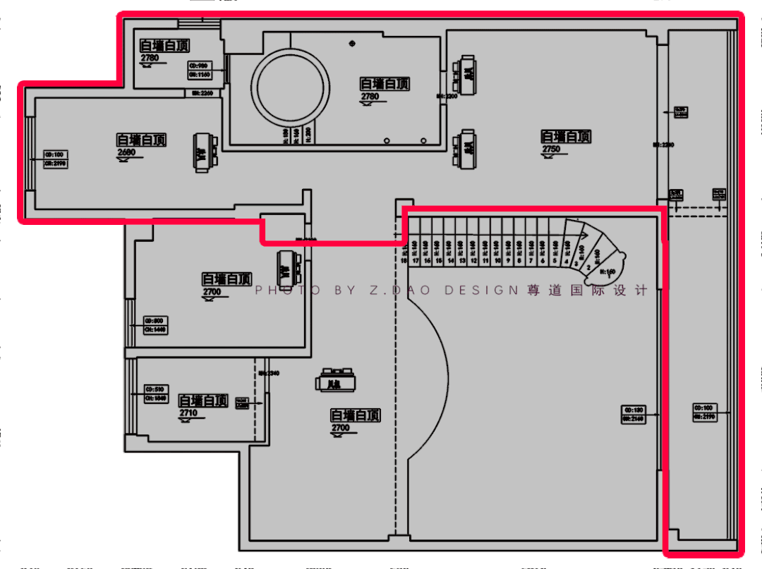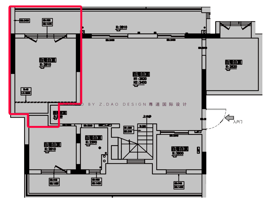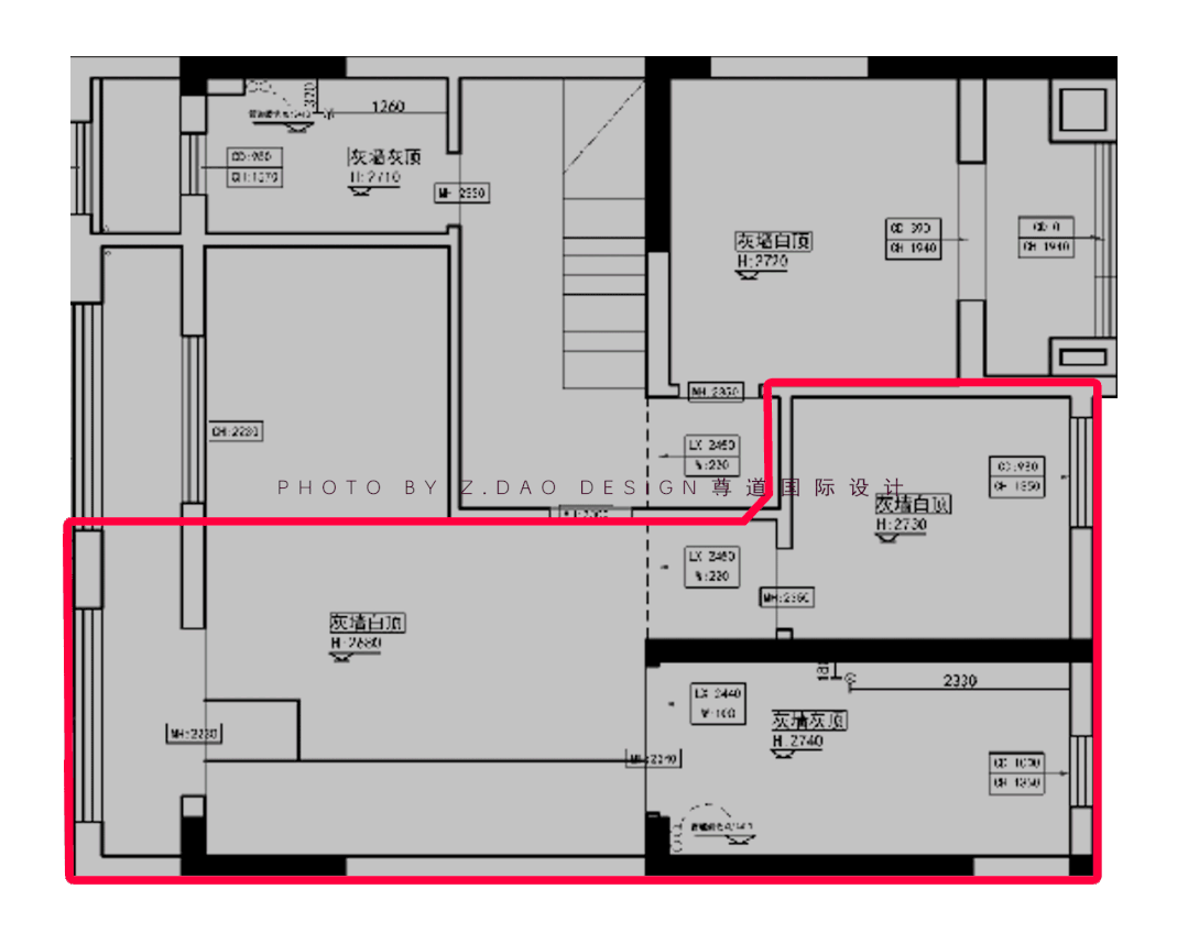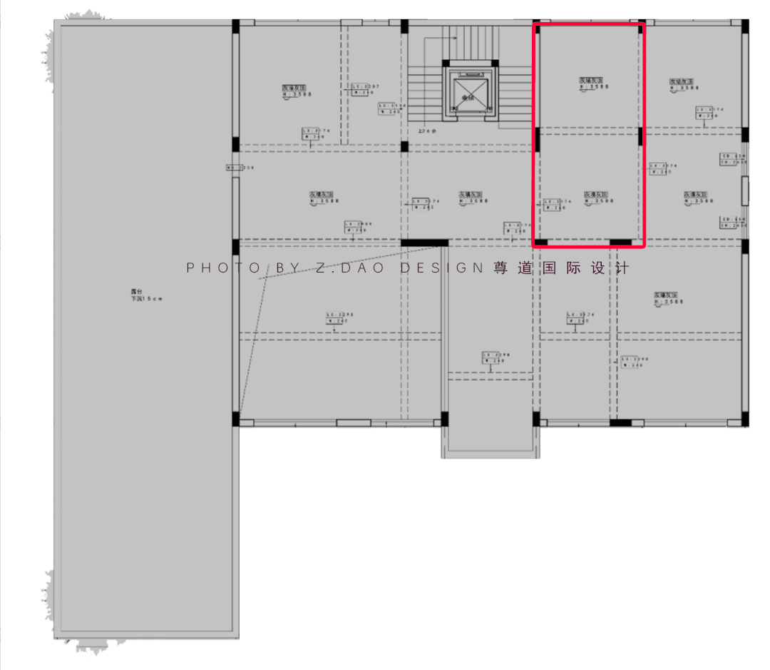 此图为别墅三楼方案,原始结构空间零碎,动线不合理,且无大宅的尺度感。