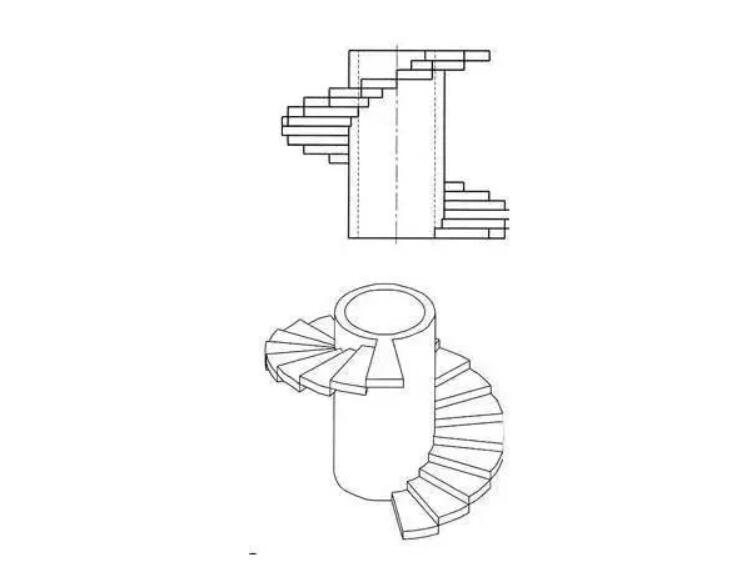 还有一些楼梯虽然弯曲,但并没有一个固定的转轴,不会独立形成旋转形态,它常常与旋转型曲线配合,形成以旋转轴曲线为主,非旋转轴曲线为辅的复合型弯曲楼梯,所以我们通常把所有弯曲的楼梯都叫做旋转楼梯。