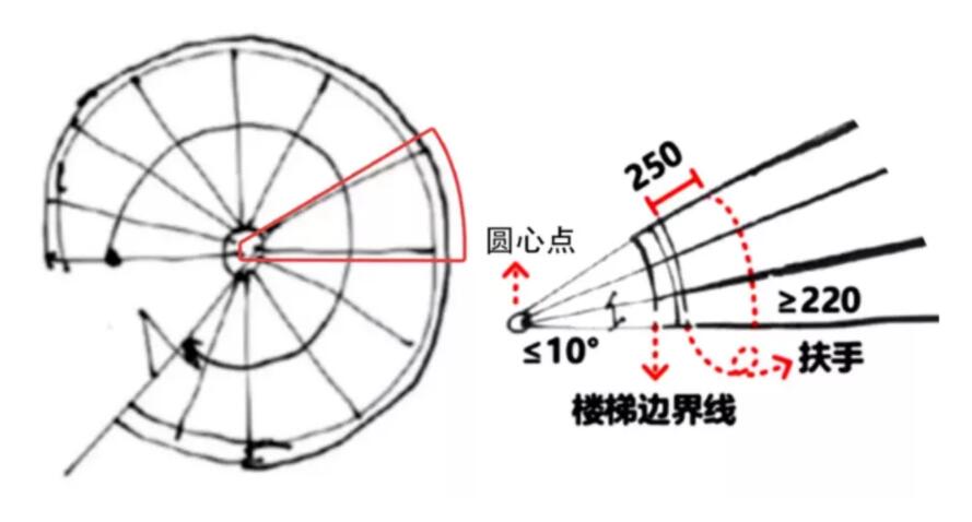 TipS:踏步上下两级所形成的平面角度不应大于10°,且每级离扶手250mm处的踏步深度不应小于220mm,如下图所示。