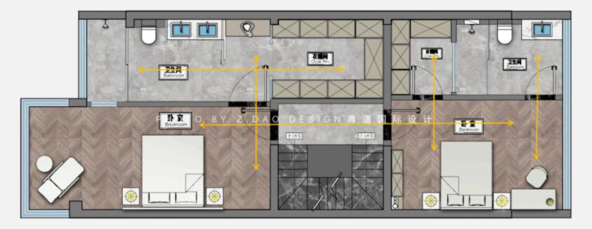 ① 公共卫生间设置在卧室和客厅过渡的地方,避免影响家人休息。