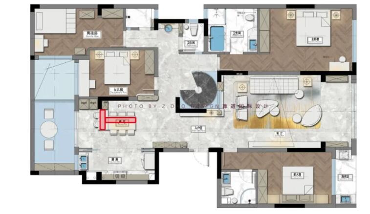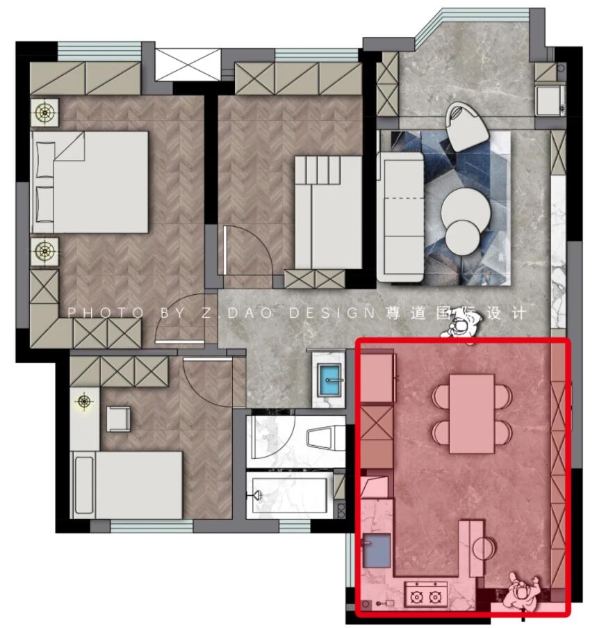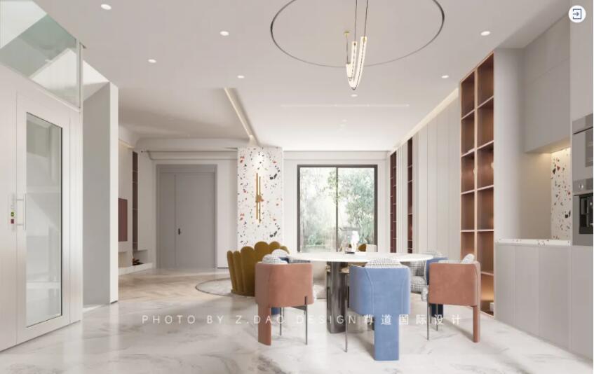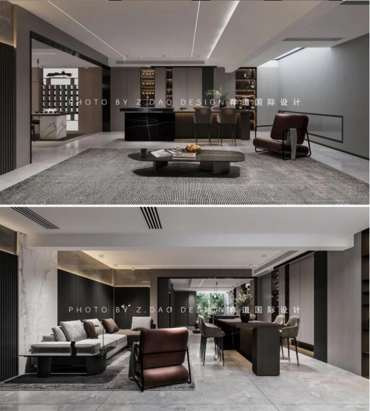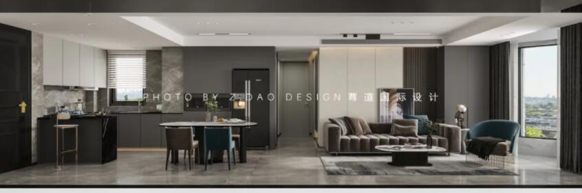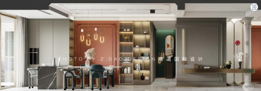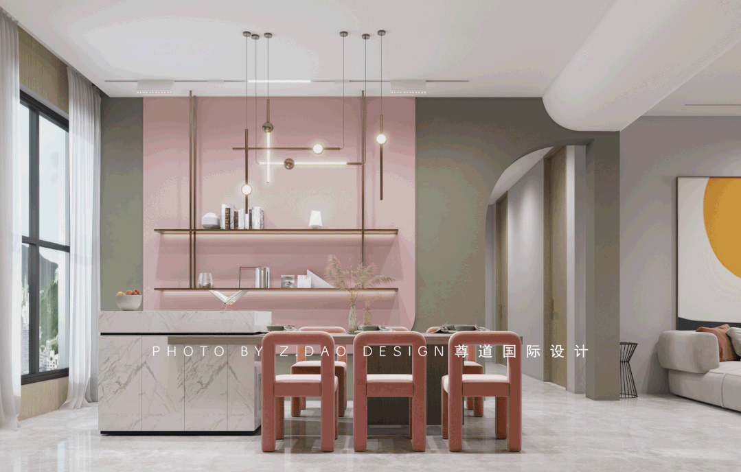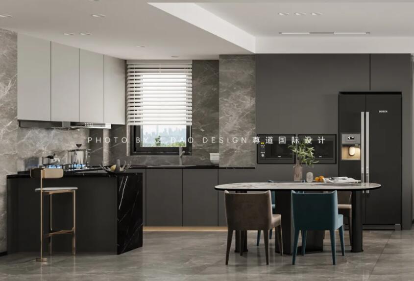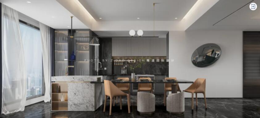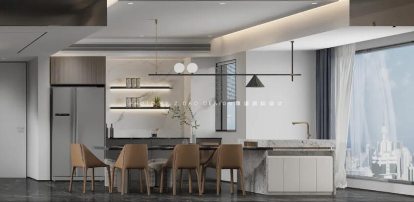 餐桌吧台“T字形互动场景”,增加厨房与餐厅的社交属性,丰富立面视觉、强化空间层次。