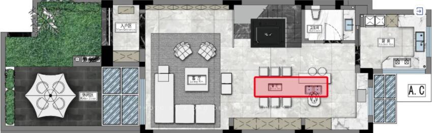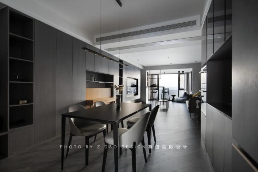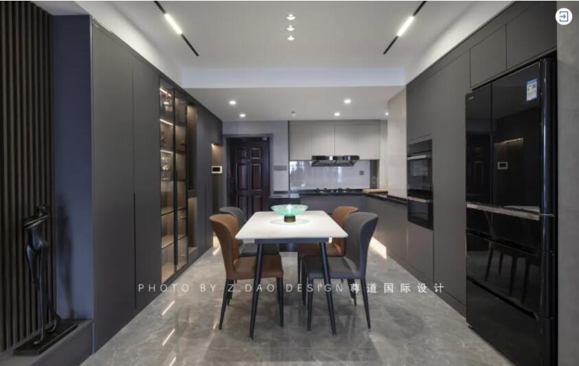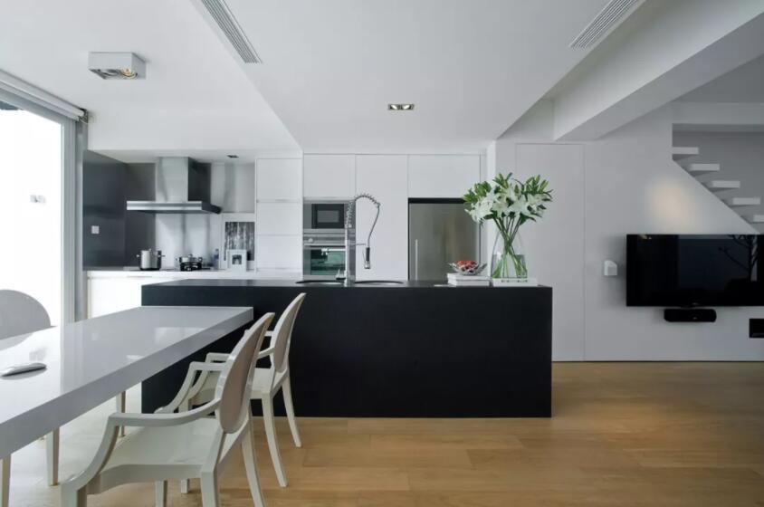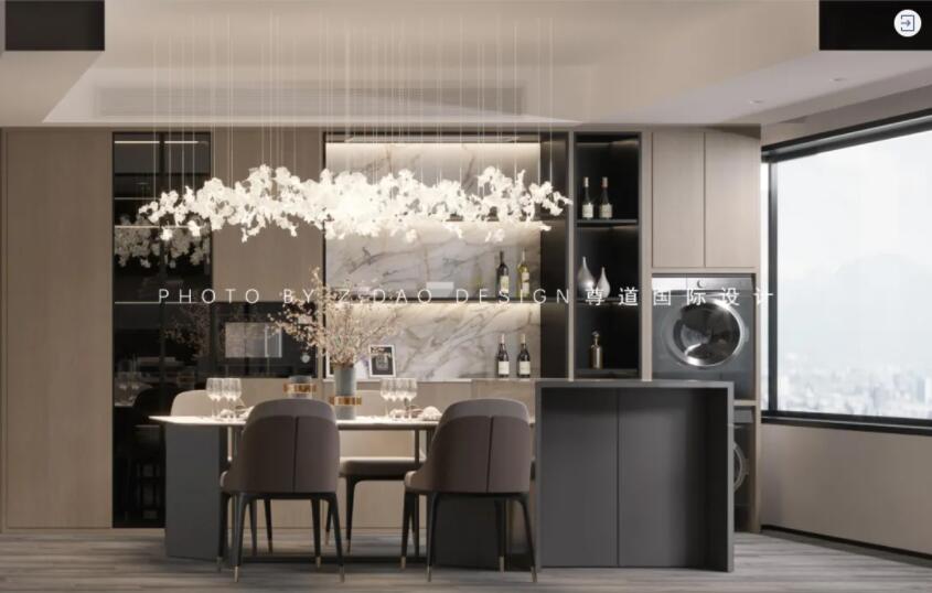 餐桌咬吧台,特点:延长台面视觉空间,餐桌与吧台“一字型”,巧妙利用餐厨间互动区域,用餐距离也大大缩减。