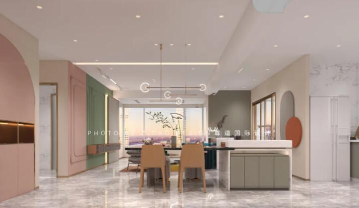 餐厅区域顶面做了和客厅连接一起的造型顶,丰富了顶面空间的设计,也规整了区域性,餐厅与客厅、厨房呈开放之姿贯连,将空间尺度拉升到极致。餐厅内欢快的撞色更易调动味蕾。餐厅圆桌加上柔美的吊灯,这是一个极有视觉体现的空间。