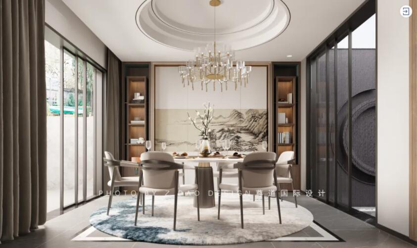 中西厨加餐厅的空间感匹配客厅的通透性,这才是大宅该有的布局,西厨的展现,也是餐厅的一道亮丽空间表现,这是一个使用和轻奢的体现,餐桌微带的丝丝黄铜不锈钢金属,也是奢华的一种态度。
