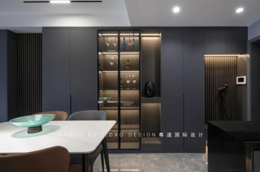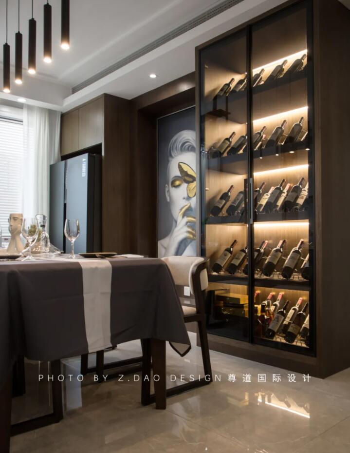 整墙而立的酒柜,收纳“一柜”搞定,加入金属铝框玻璃门,增添设计感,独具品位,视觉上更为通透。