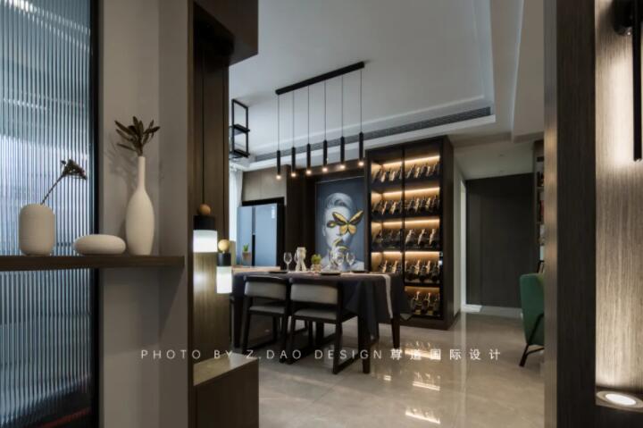 考虑搭配厨房空间小,冰箱放在餐厅空间,作为对称右边设计有酒柜,酒柜里可以放下几十瓶红酒,完全可以满足女业主的品酒爱好。
