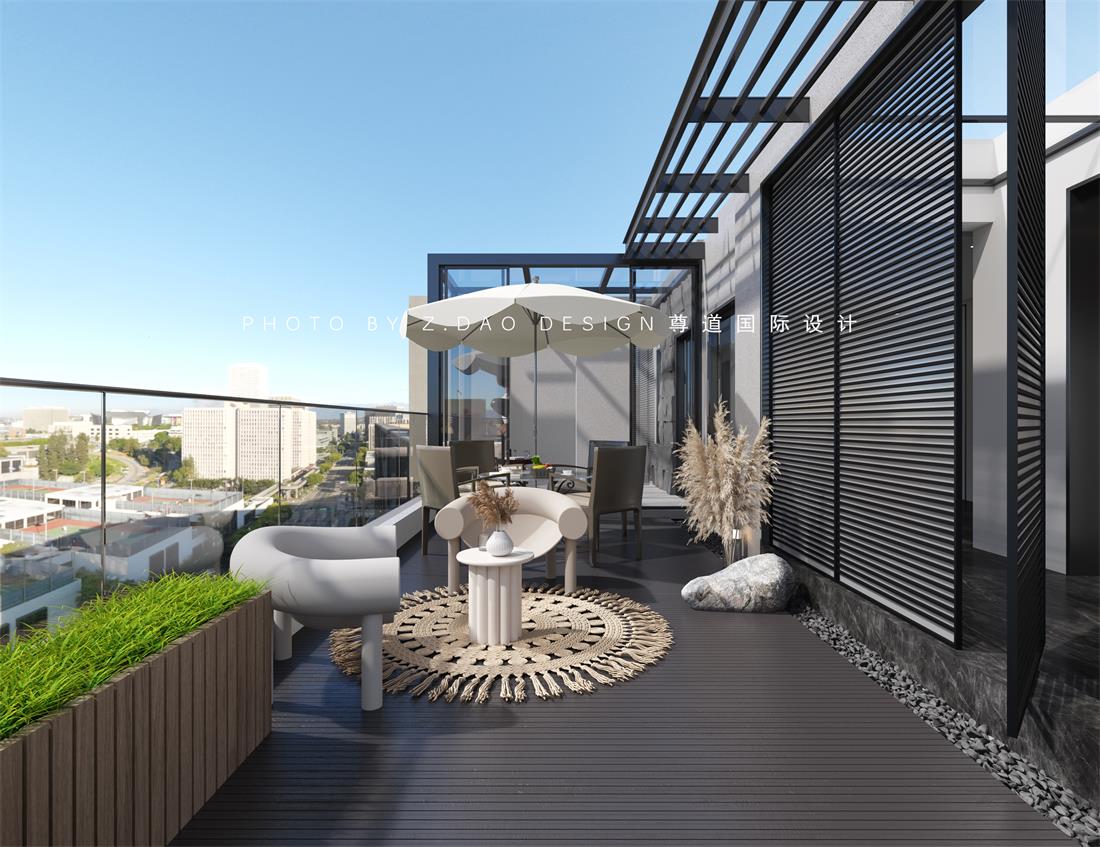 露台被生活空间缩减了,但是合理规划后的重现是最美好的,出入露台设计了旋转门,这是一个空间的重要仪式感,露台地面用深色的防腐木做地面的铺装以及用了鹅暖石做了地台和地面的分割线,这也是一种材质的碰撞,互相的吸引。