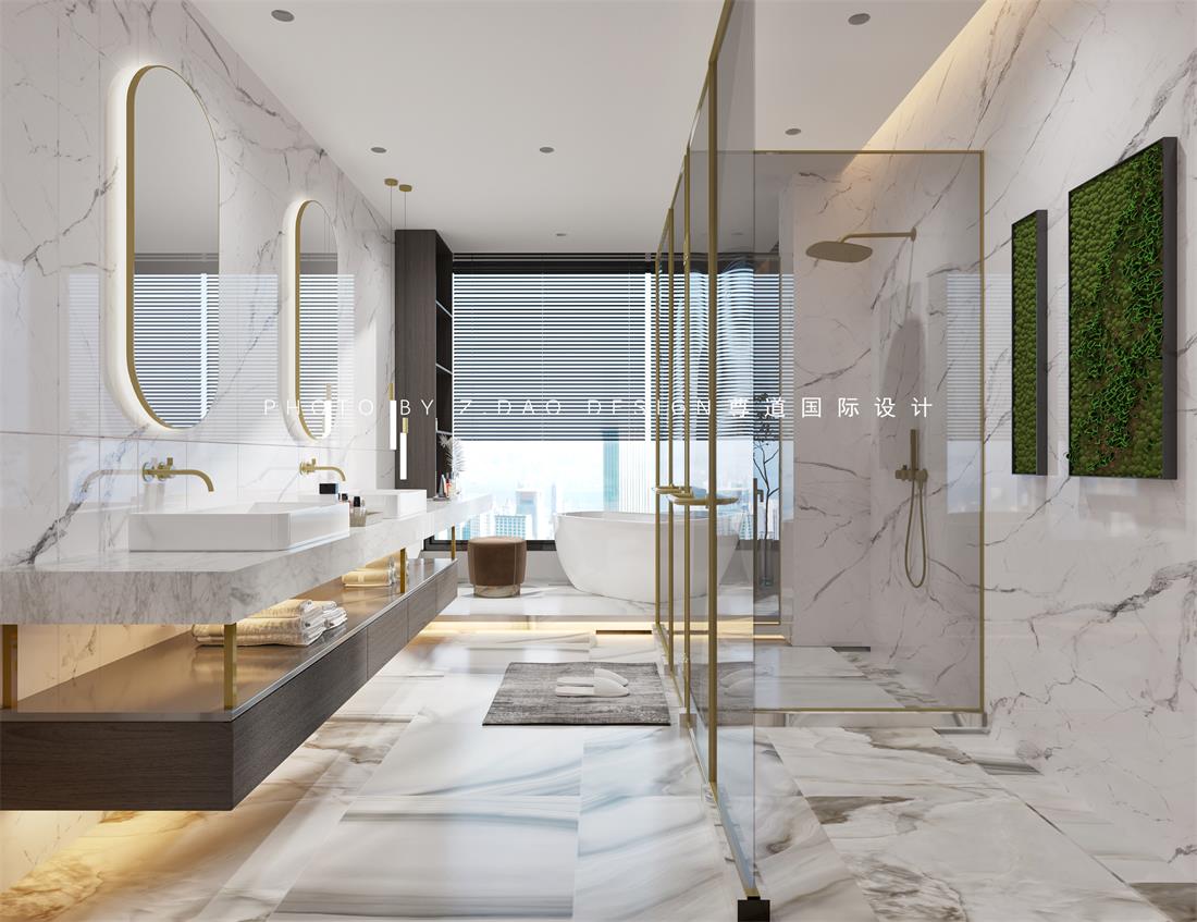 卫生间设计了三分离,这样空间的分割合理性更强,双台盆的洗手台,加上梳妆台的摆放,让生活的仪式感迸发出来,浴缸处的地面抬高,就是一种接近自然与生活姿态的体现。