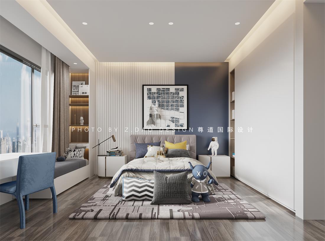 孩子的房子做了比较成熟的规划,运用了每个大男孩都喜欢的蓝色系作为了空间的跳色,卧室的面积很大,书桌的方向摆放在了窗户的位置,这也是学习文曲星的方位,沿着书桌设计了飘窗,写作业累了,就停下来躺着看看书,这也是一种学习方式。