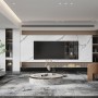 原始的客厅和一层的南阳台做了融合,让空间得到了舒展,也将南阳台的空间得到了最大化的利用,电视墙的设计也是因地制宜,因为原先的南阳台两边的墙垛是承重,所以不能拆除,所以做了厚的柜子,刚好将垛子遮挡住,因为入户和南阳台的两道梁体较低,所以中央空调放置在了电视墙的上方,这个电视背景的设计也由此而来,主体用了鱼肚白的岩板做框架,内部做了超薄的钢板做隔板,电视机是嵌入式的,黑色的钢板和电视机形成了一个黑色的框体空间,这是一种设计空间的错觉手法,让空间的横向感拉伸,电视柜用了黑白根的大理石做了造型,放置了电子壁炉,增添了空间气氛感。