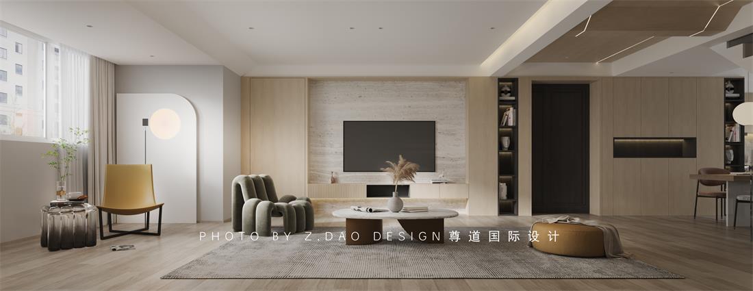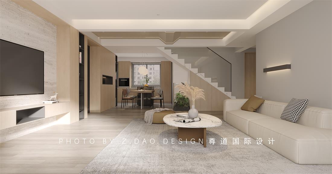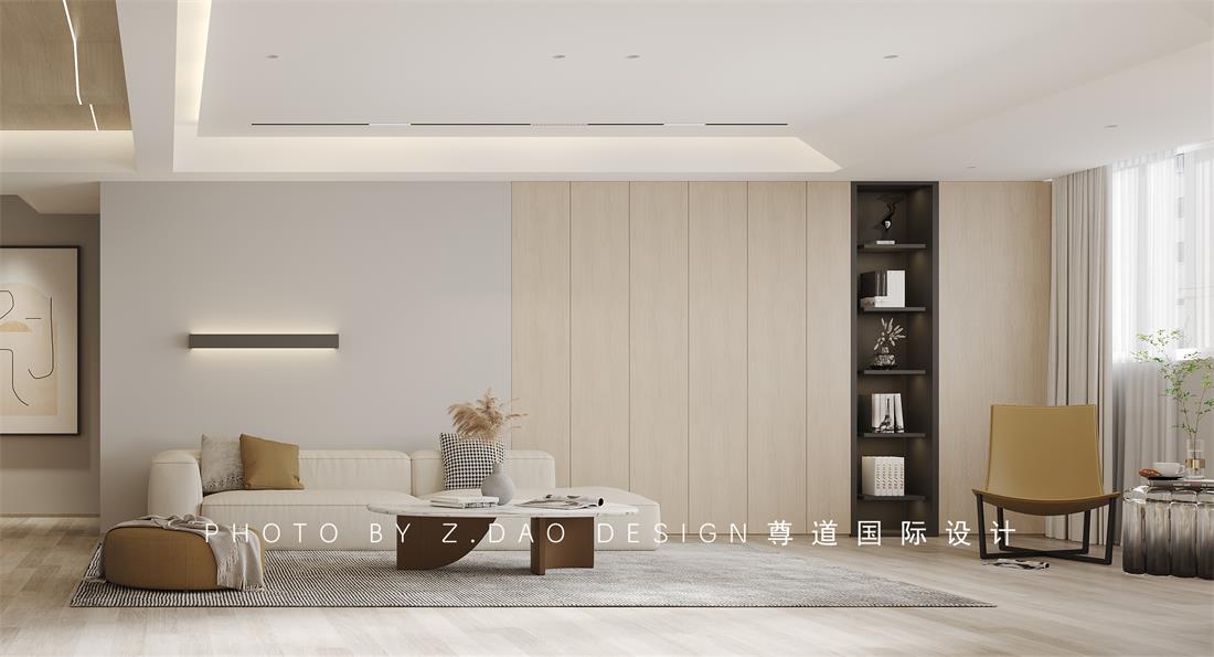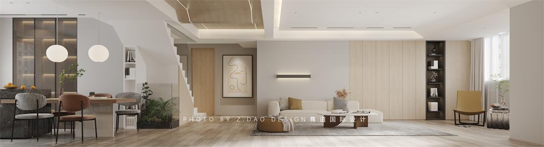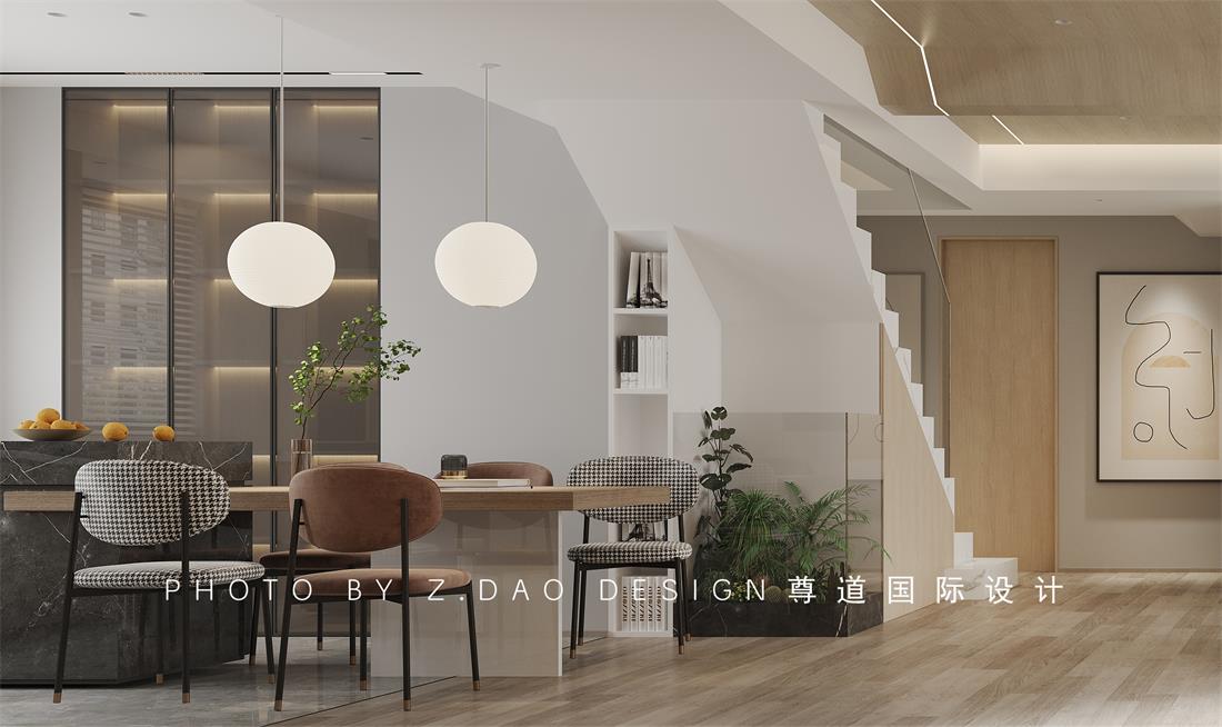 客餐厅整体空间以素雅为主,白色与原木色为主,搭配黑色木质展示柜,赋予空间无限的想象,同时兼顾艺术与品位。夫妇二人喜爱安静、简约,以白色为墙顶面基调,无主灯设计,富有层次感的吊顶搭配反光灯带,视觉上拉升空间层高,让空间更为立体。