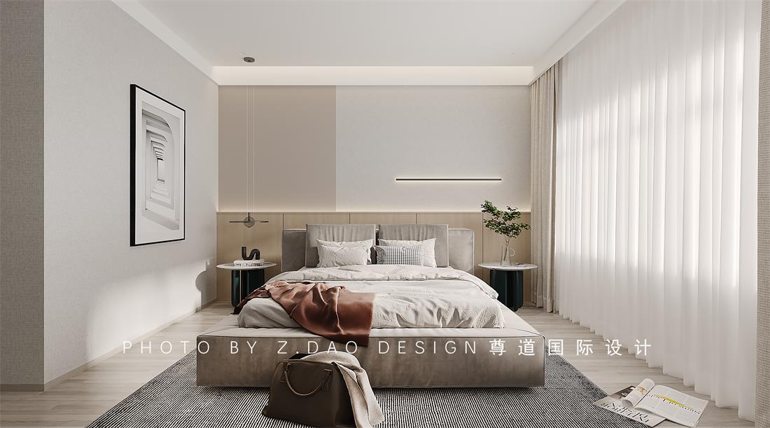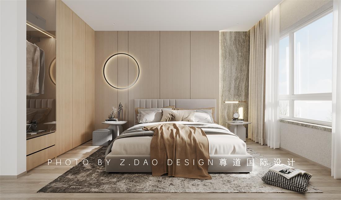 木地板与木饰面成为卧室空间的主导材料,从公共区域延伸贯穿主卧,营造空间的一致性。洁白的顶面搭配原木与大理石背景墙,反光灯带的使用,营造丰富的空间层次感。