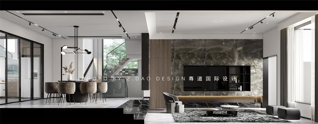 客餐厅由两节踏步作为整体空间区域的体块划分,开放的空间由光带从顶面延伸落地,成为衔接玄关、客厅和餐厅之间的桥梁,形成不同边界的交汇。自然、稳重的色调点缀出这个线条空间冷静的温度。