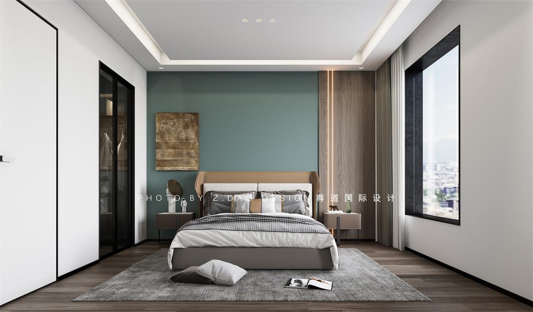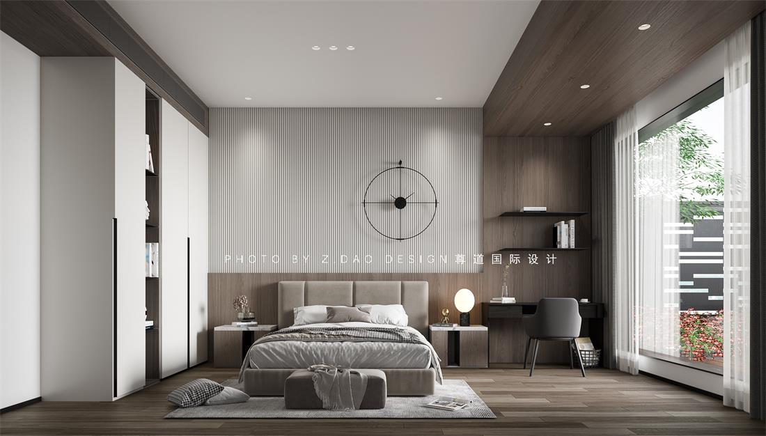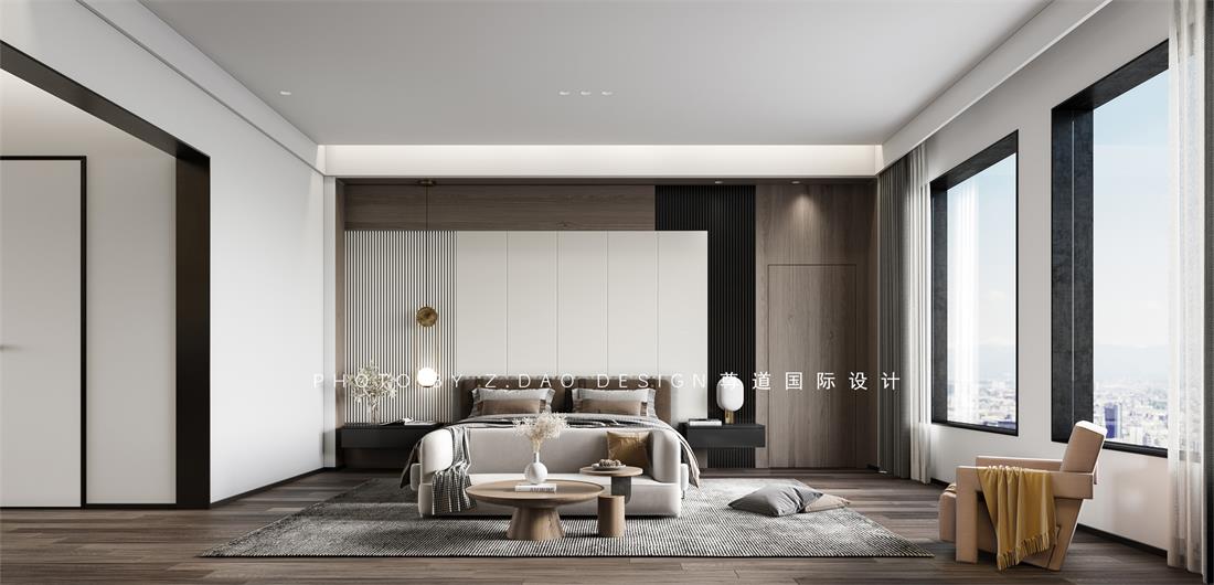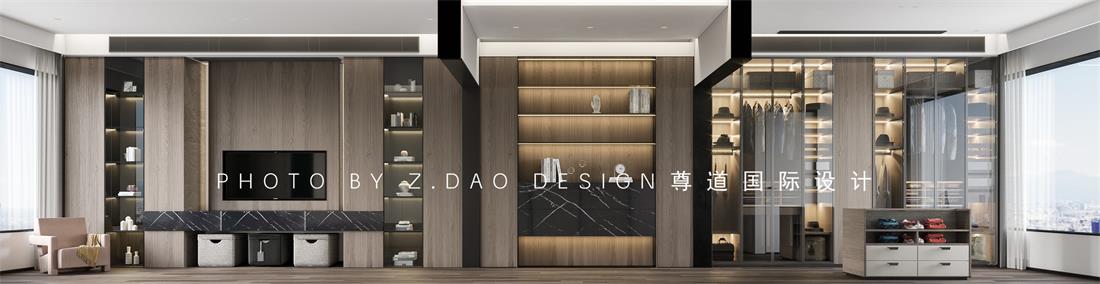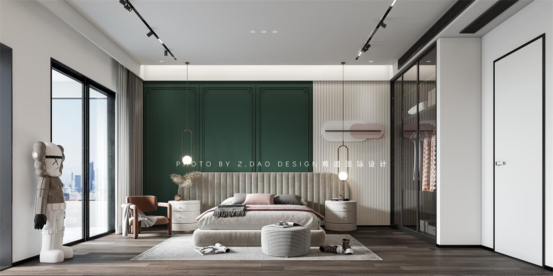 推开隐形双开门进入私领域,更衣室与卧室相连,静谧且舒适的空间感。