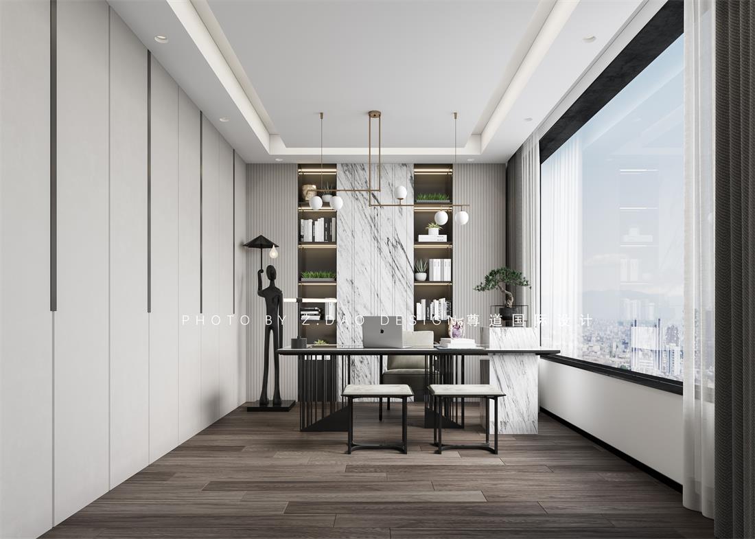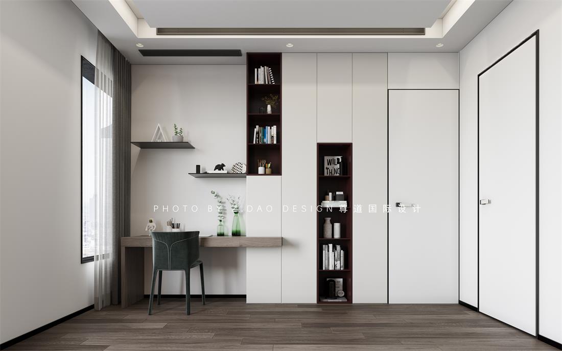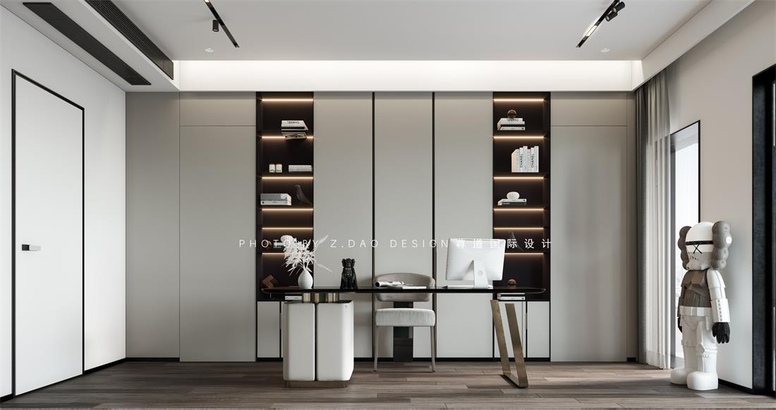 书房布置得轻松自在一些,没有太多家具,书柜采用嵌入式设计,与空间形成统一,开放式储物格搭配玻璃掩门收纳,让使用者在工作时不会产生封闭感,便于打开思维。