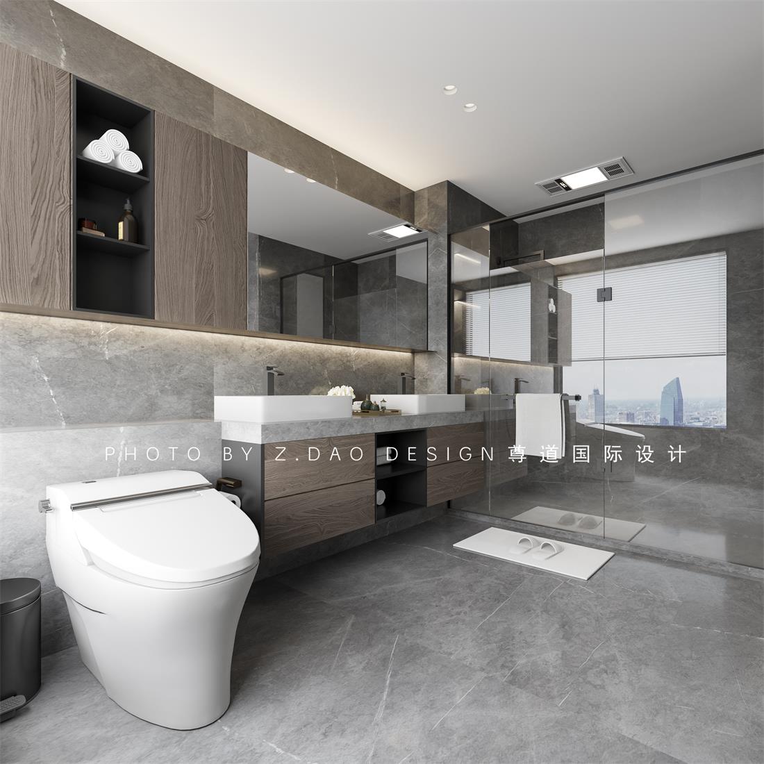 卫生间采用的悬挂式的智能马桶,干区和湿区通过玻璃隔断门进行分区,并且延续了卧室、过厅、衣帽间的三大色系。