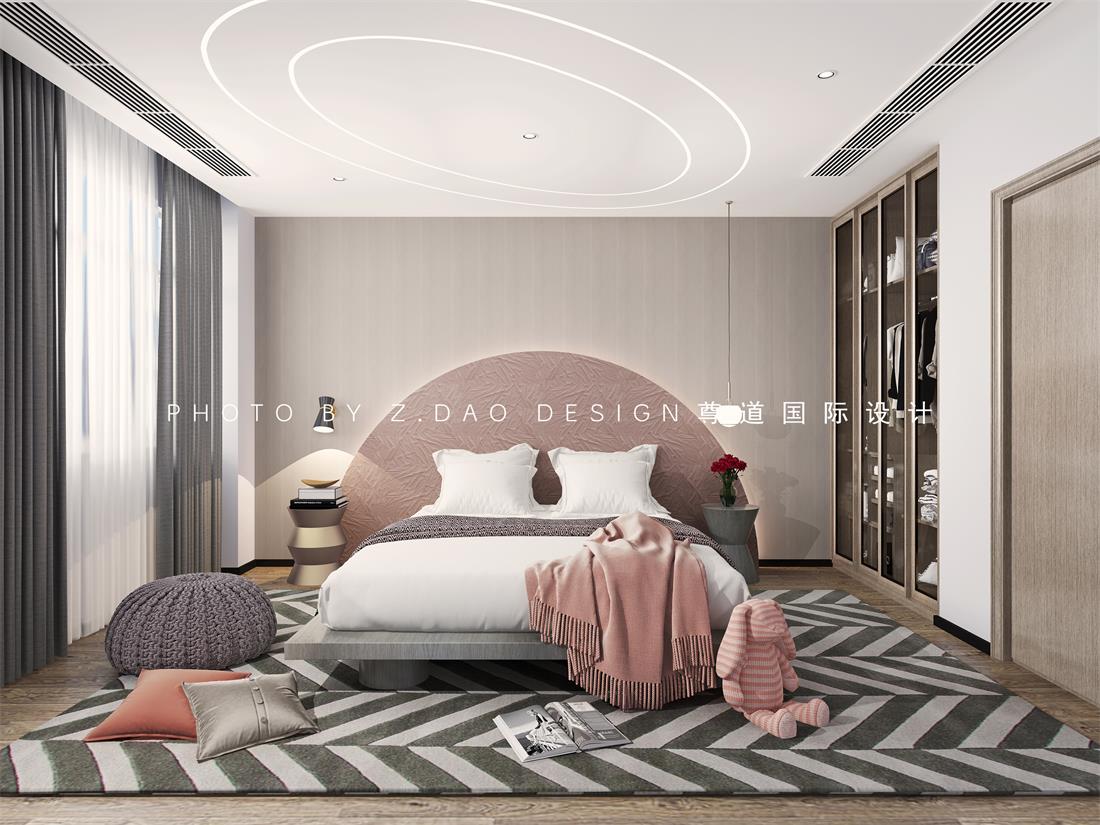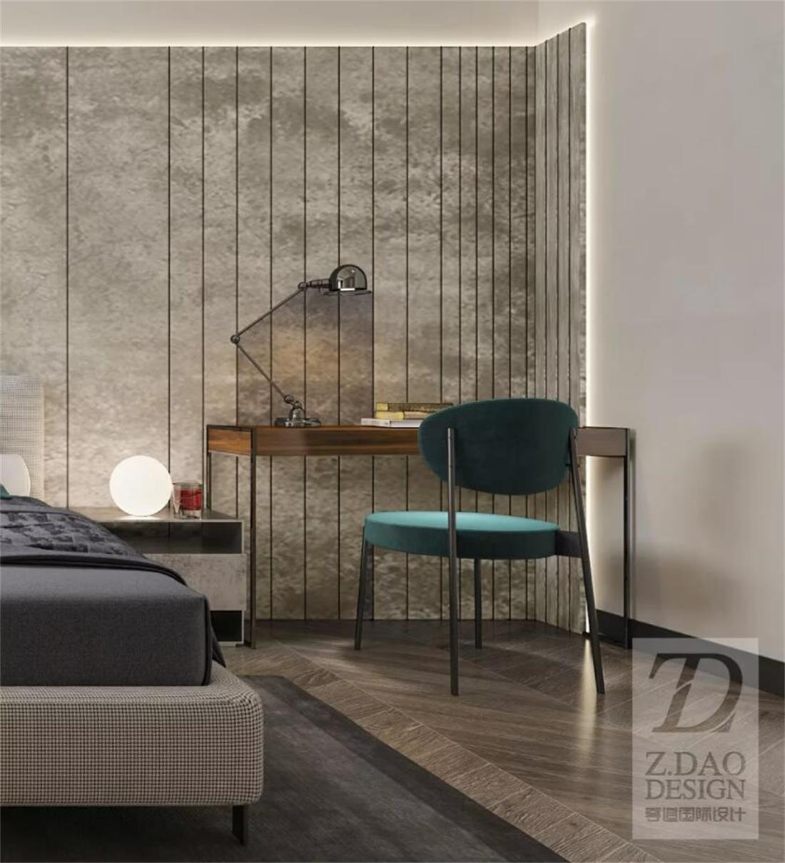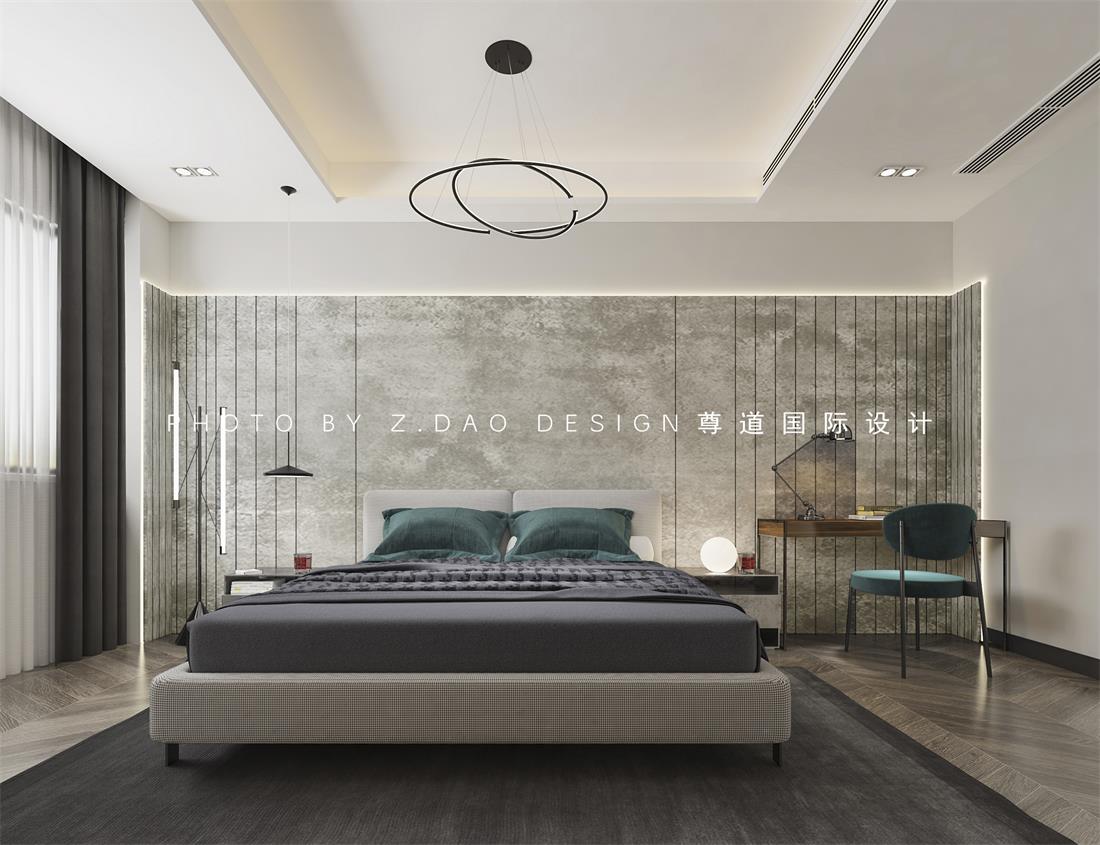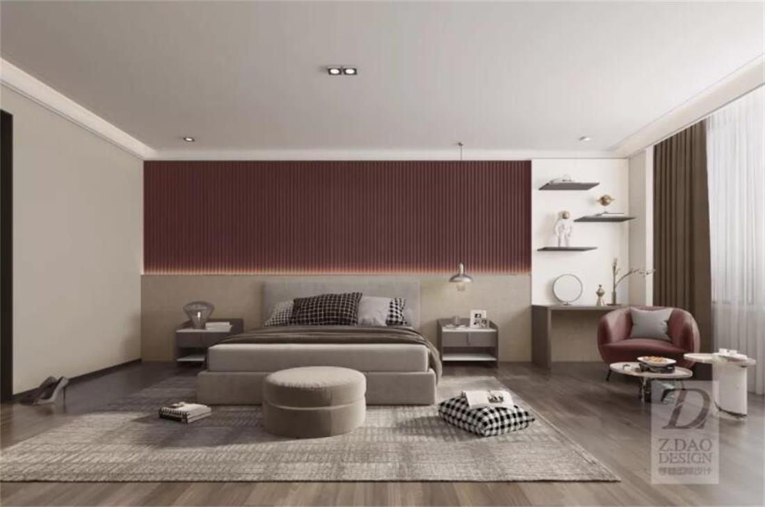 主卧室的设计体现出业主随性与休闲的家居生活,同时对生活品质的追求,床头背景是以错层式的木质设计,床头背景上面是暗红色的长城板,下面用硬包设计,旁边留了一个书柜作为男业主在家偶尔加班所用。