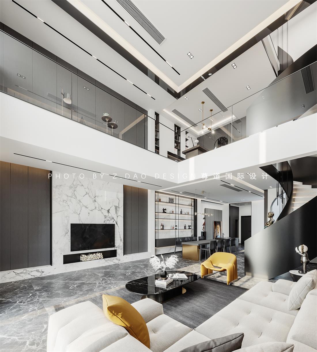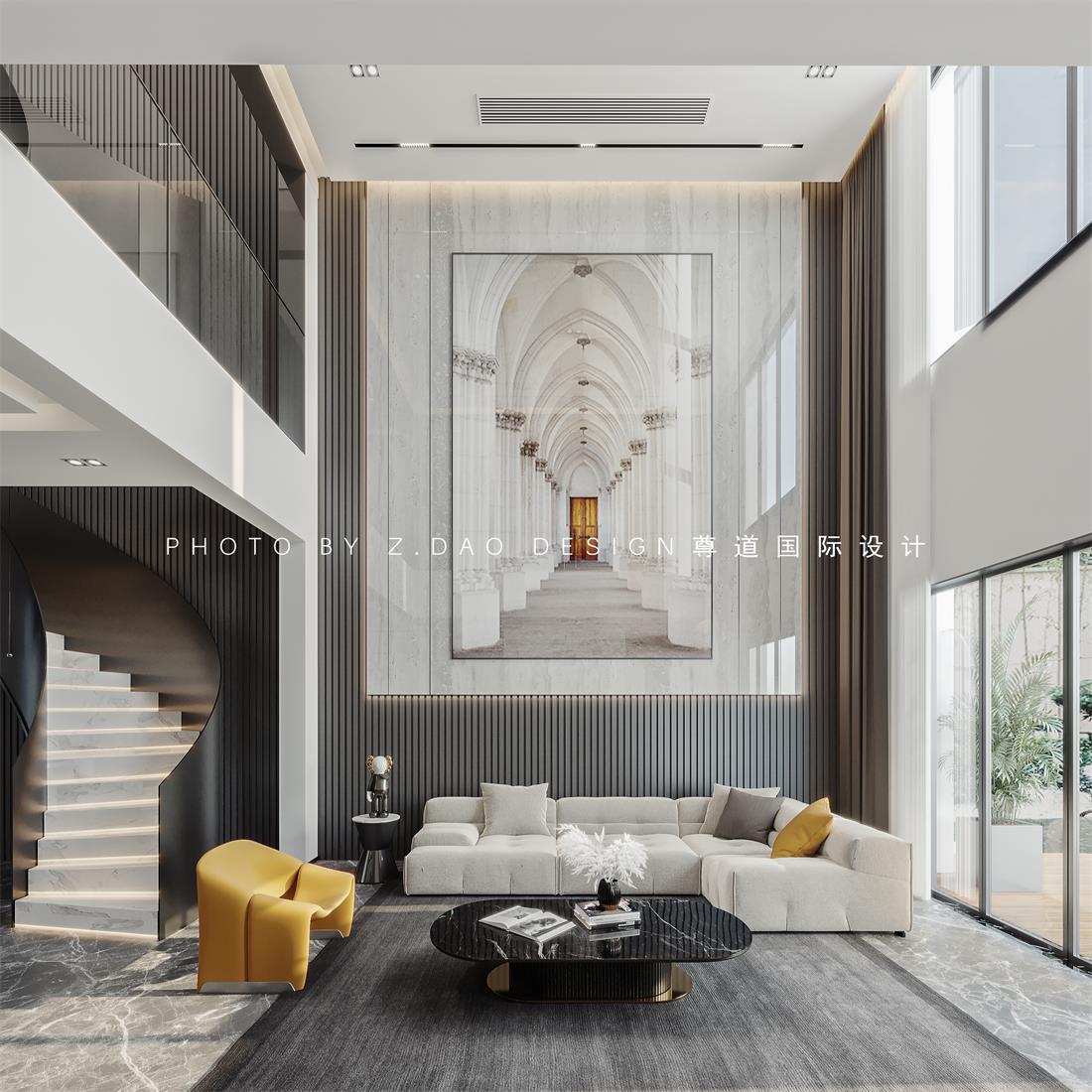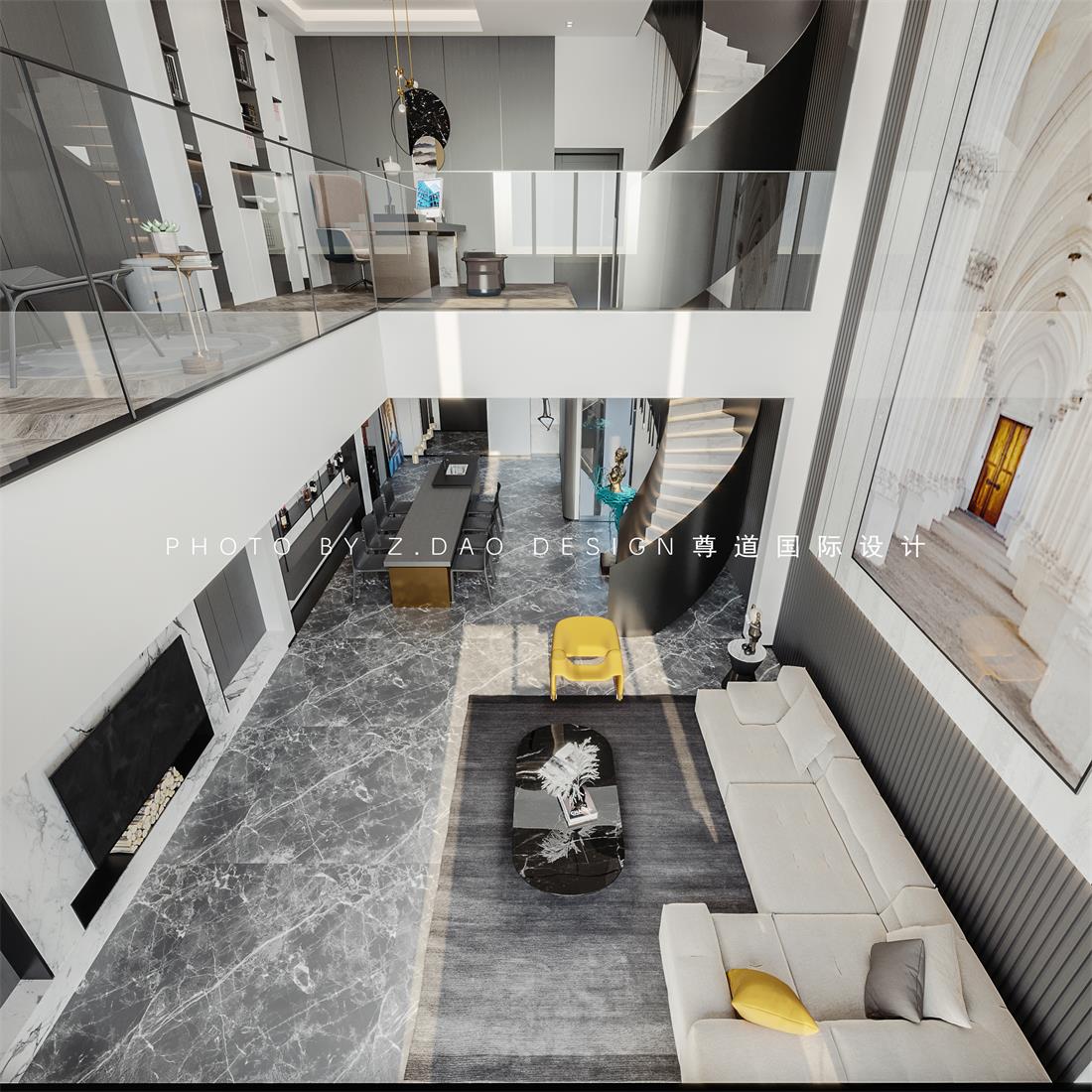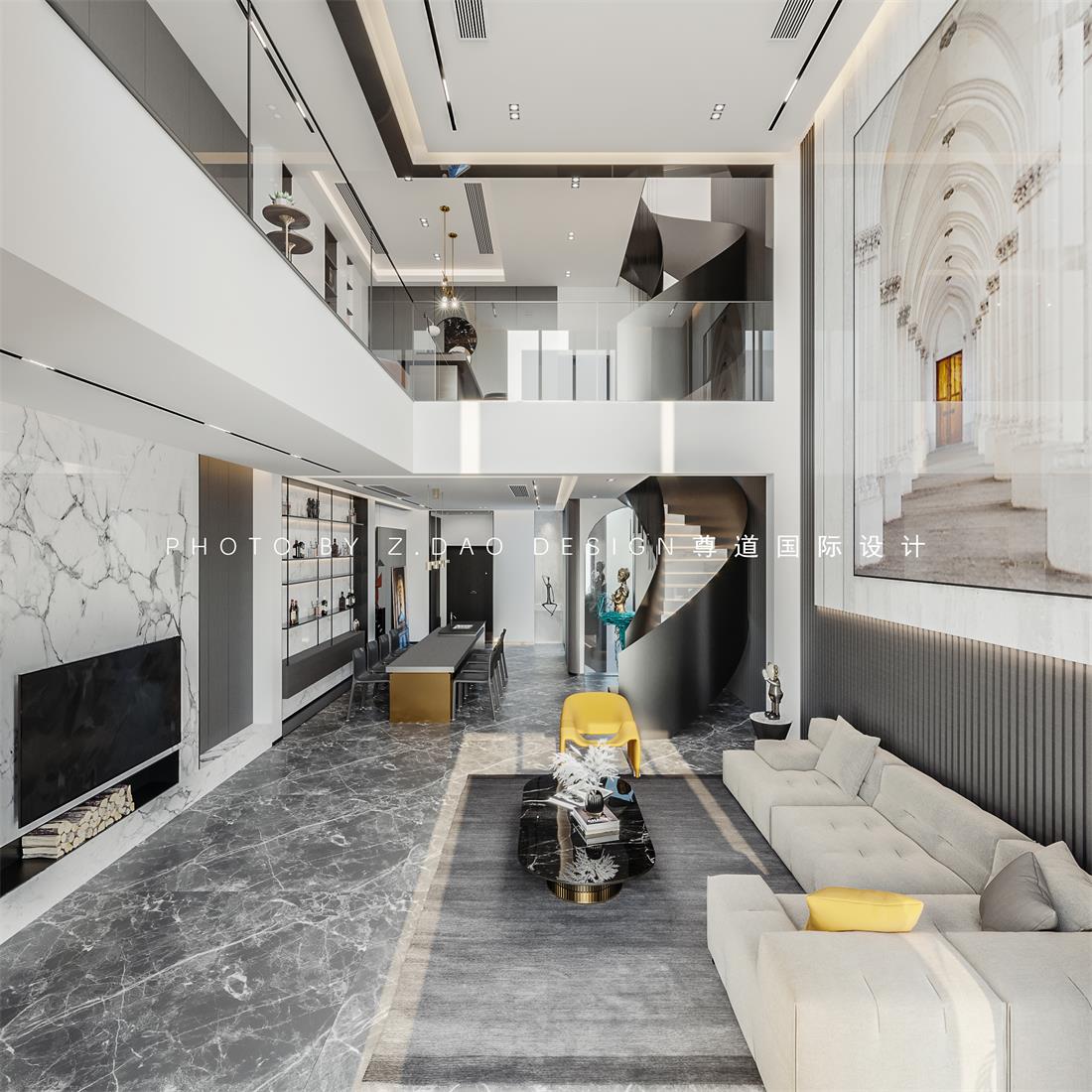旋转楼梯从一楼到三楼延伸到顶,带动了整个空间的灵动的氛围。