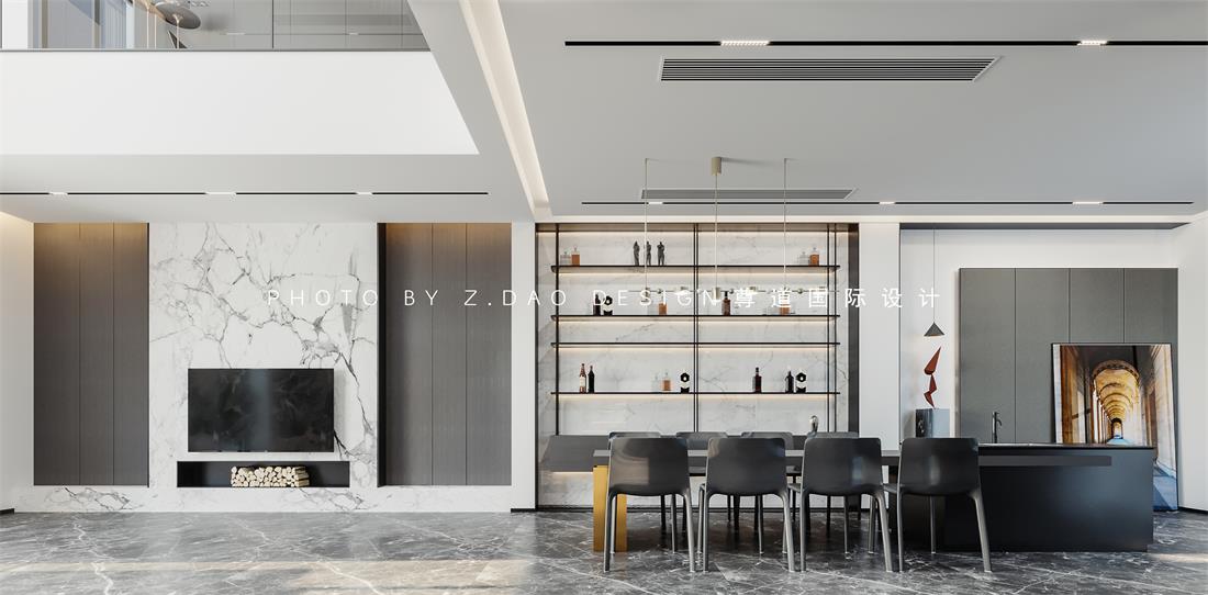 沙发背景是以长城板为背景,大理石作为主基调,数根线条的设计拉伸了整个空间高度,使本来就是跳空的空间闲的更为有些高。