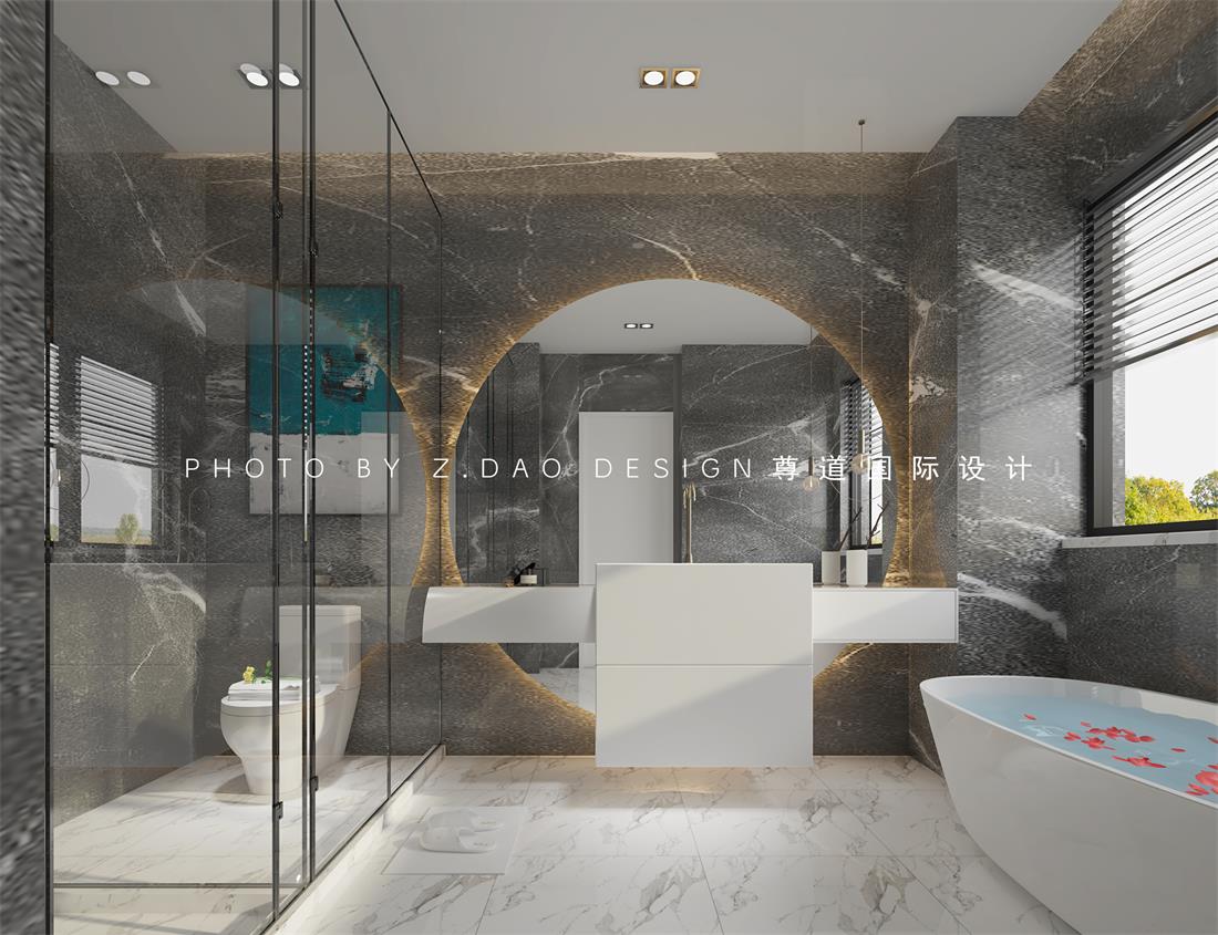 干湿分离的卫生间,简洁的深灰色大理石墙面,圆形的浴室柜镜面,打破整个空间的硬朗线条感。除去淋浴房外,这里还为主人配置一个超大浴缸,主人边泡澡又可边欣赏窗外风景。
