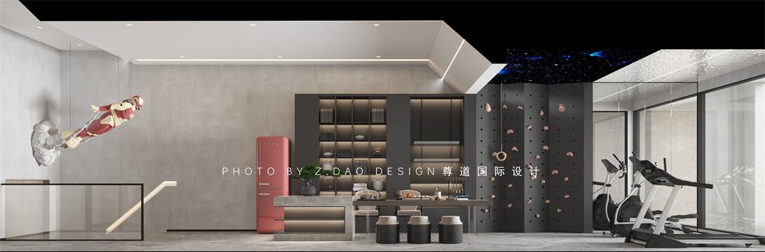 地下室的空间就是业主喜欢的和要表现的空间,这里有喝茶的,有小朋友攀岩的,也有业主锻炼健身的,吊顶上我们运用了原始空间的梁体位置,做了斜面顶以及星空顶和水波纹不锈钢顶。几种不同类型的吊顶材质,在空间上的碰撞,一定会产生更加梦幻的效果,攀岩结合星空,健身区柜子故意做了玻璃镜柜,让空间更加延展,插座和岛台的结合,让美观和实用结合,去到影音室的下沉楼梯,我们调整了方向后,也更加的适合空间,墙面的内藏扶手槽,加上灯光的点缀更加的充满设计感。